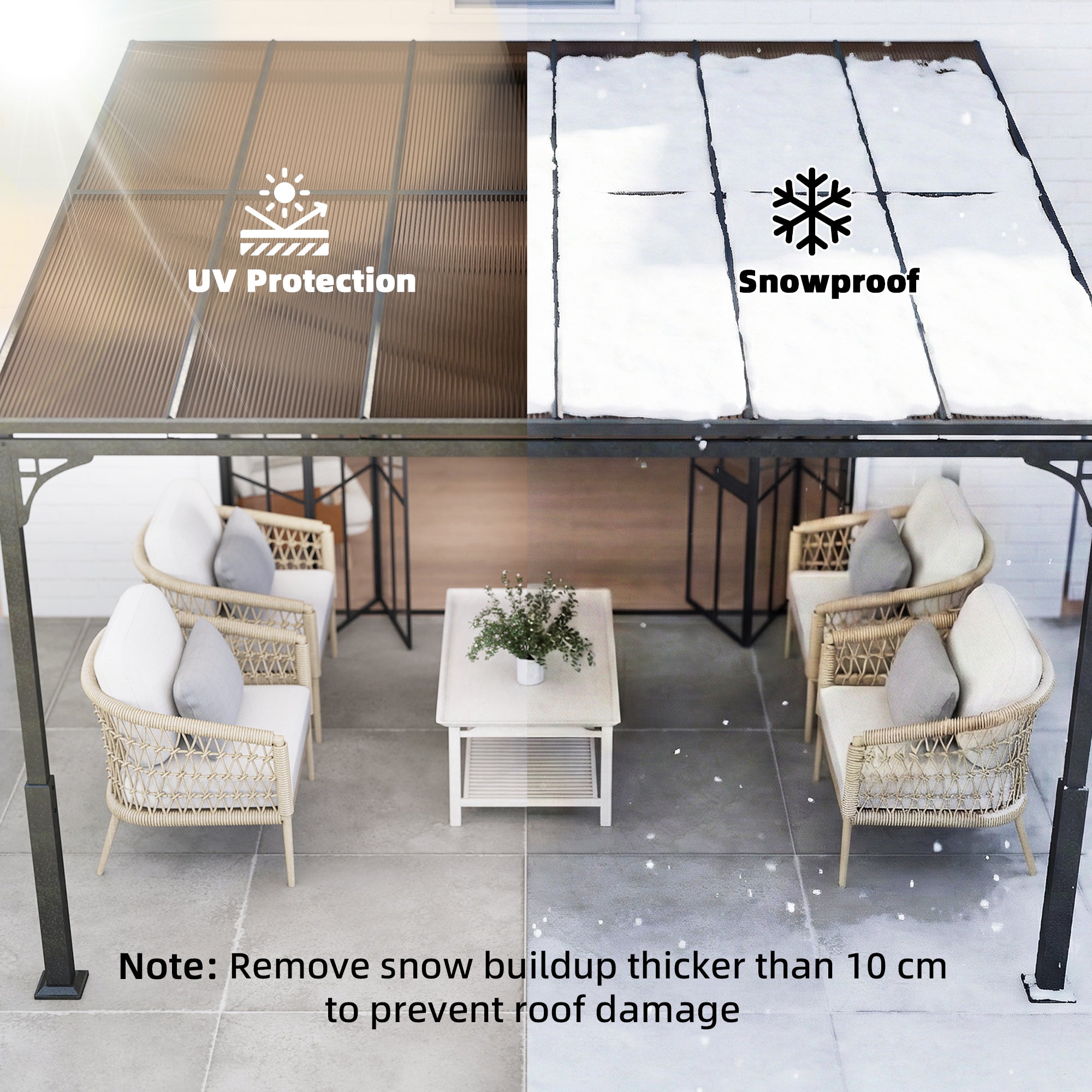 Outsunny 3.4 x 3 m Metal Lean-to Pergola, Wall-Mounted Garden Pergola with Polycarbonate Roof and Metal-Aluminium Frame, Heavy Duty Hardtop Gazebo for Outdoor Patios, BBQ, Brown