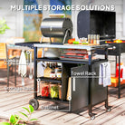 • Integrated storage shelves, hooks and a towel rack keep grilling tools within reach