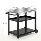 Plan to host some friends? Take entertaining to the next level with this Outsunny outdoor BBQ trolley. Featuring a stainless steel tabletop, two shelves, a handle that doubles as a towel rack, and many functional hooks, this BBQ table can hold all your meals, drinks and seasonings. Easily portable with the large wheels and side handle, the pizza table is excellent for meal prep and serving at picnics, BBQs, or family get-togethers. Get on a roll with Outsunny.