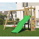 The Rumble Ridge Rock Wall with a double Swing is an encompassing timber play set. With a tower, ladder, rock climbing wall, slide and a swing, this dynamic equipment offers endless fun and adventure. Crafted for durability and imaginative play, it's a must-have for every garden. Get ready to delight young adventurers and provide hours of active joy.