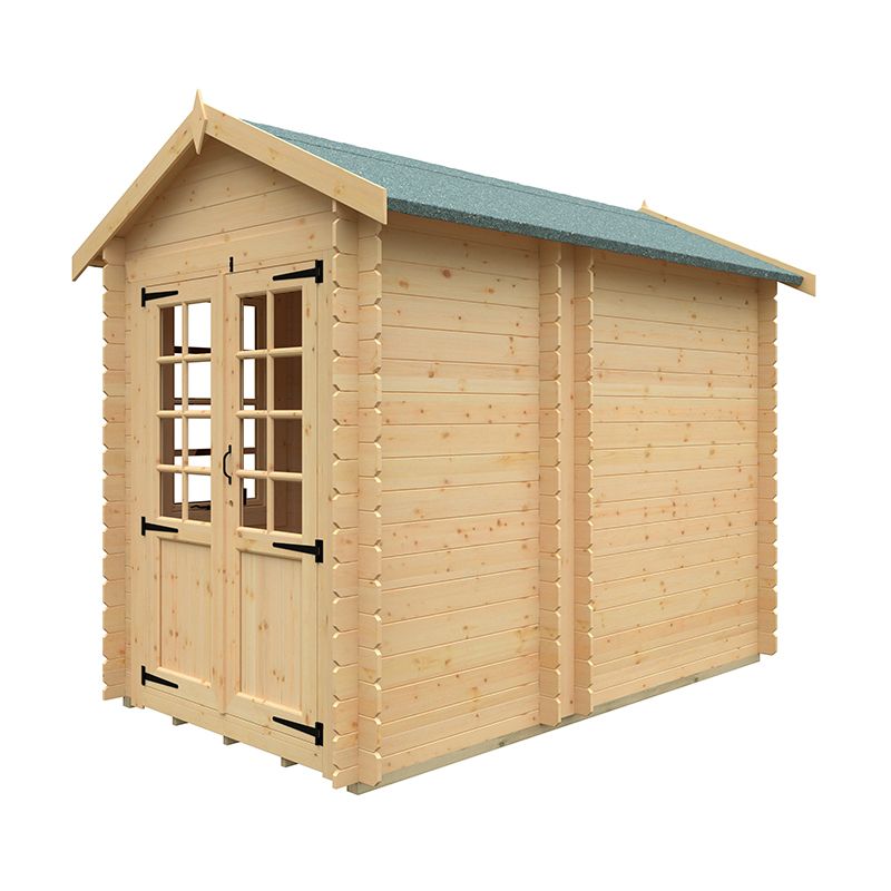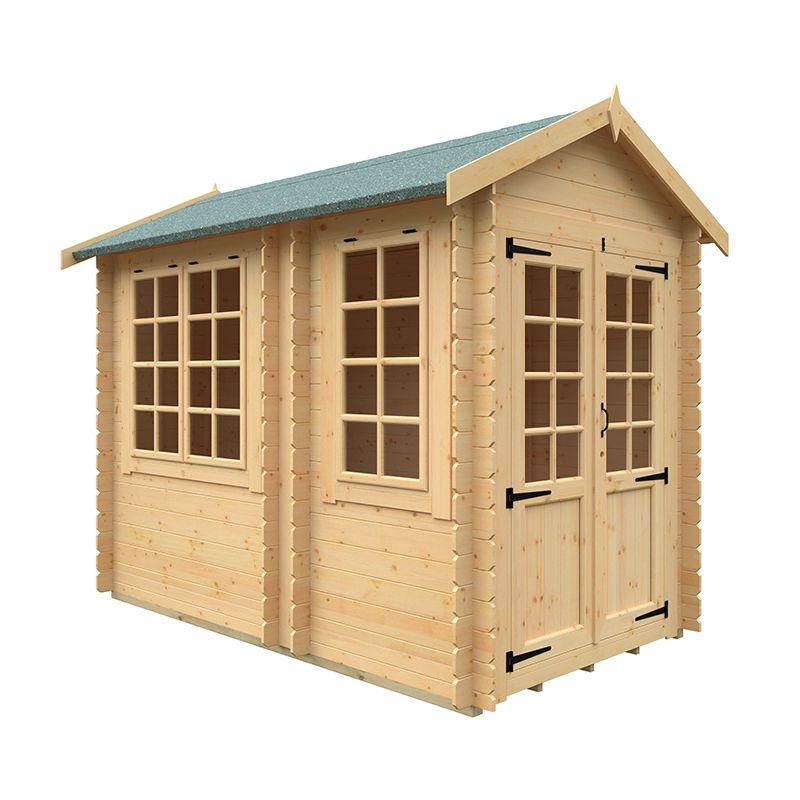 The Georgia 10x6 Garden Cabin | Flex 19mm blends classic Georgian charm with practical design, making it ideal as a summerhouse, garden office, or stylish storage space. Built from durable 19mm interlocking logs, it features half-glazed Georgian double doors, three opening portrait windows, and a 12mm tongue-and-groove floor. Pre-assembled roof panels make installation simple, while the untreated timber finish allows for custom staining or painting.