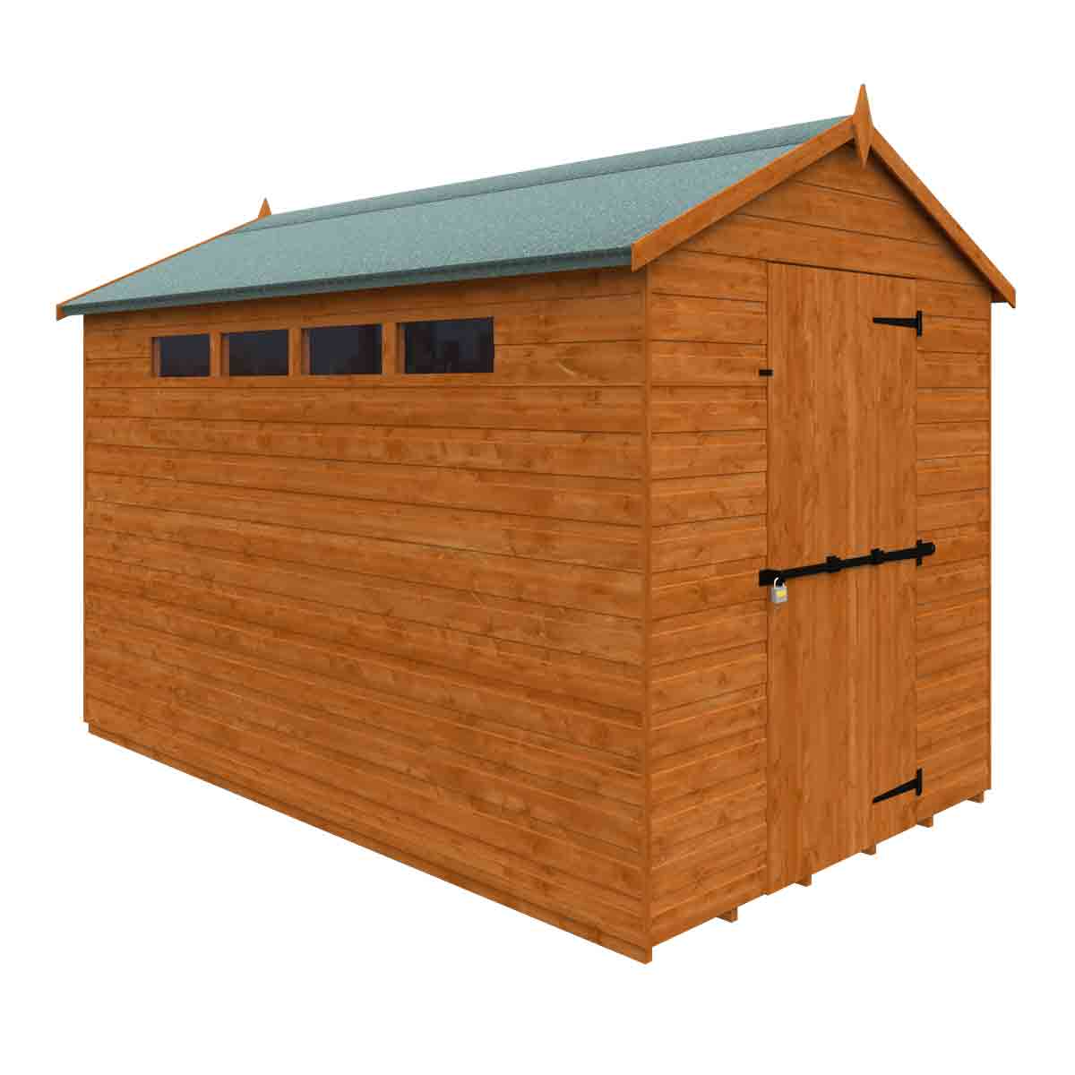When security matters this fantastic apex shed has all the features to keep your belongings safe. Fitted with a security bar and ‘slit’ windows as standard the security apex is built like a fortress. You must ensure that this garden building is assembled strictly in accordance with the assembly instructions that are provided and is installed on a firm and level base constructed from a suitably durable material. The garden building should be treated shortly after assembly, both externally and internally, with a good quality wood preserver and treated with a water-resistant treatment. Treatment should be reapplied annually to prolong the life of your building. All glazing units must be sealed, inside and out with silicone or other watertight solution of your choice (not supplied). Images and photos of products are provided for illustrative purposes only. Please note that product colours can vary slightly due to the digital photography process and variations in individual user monitor settings.