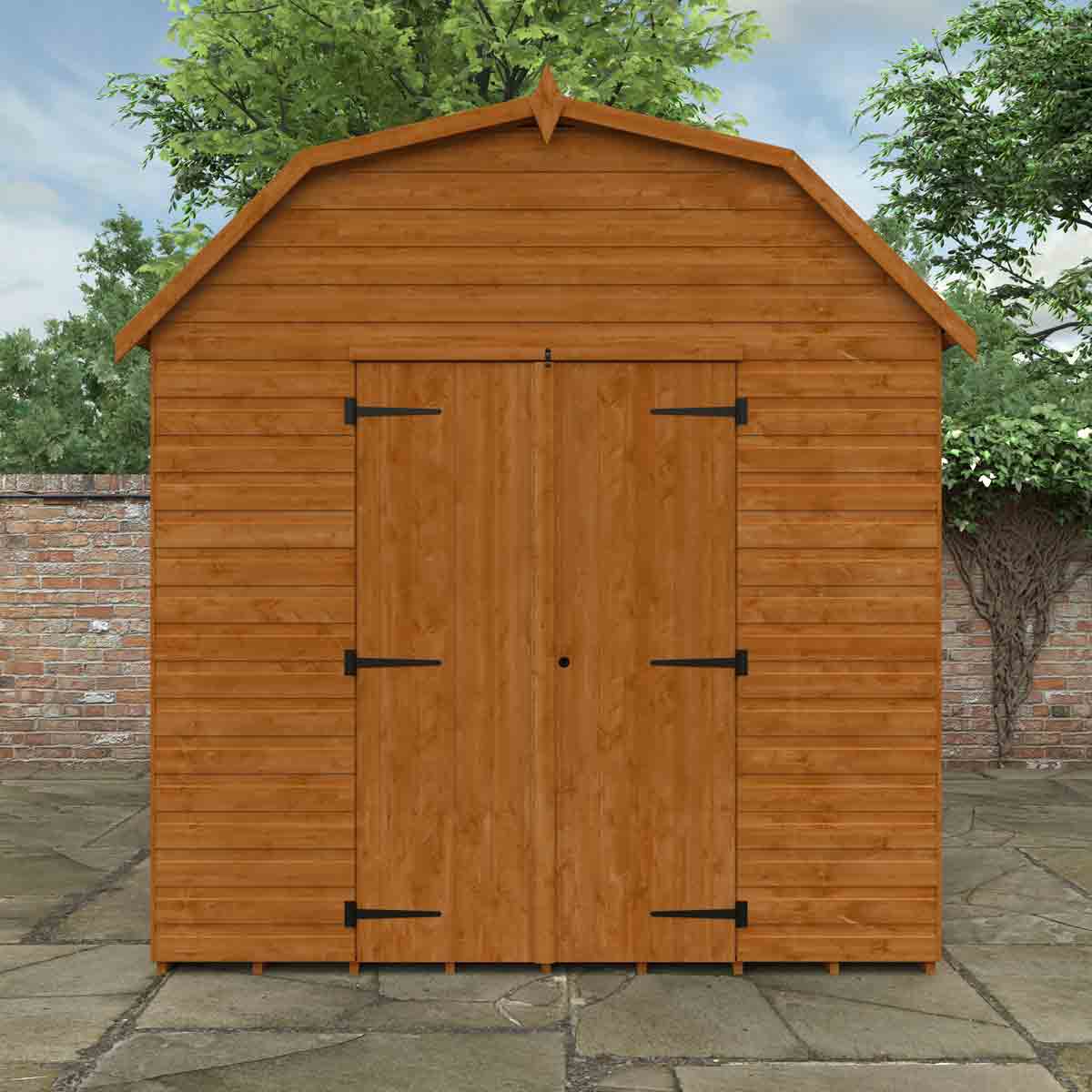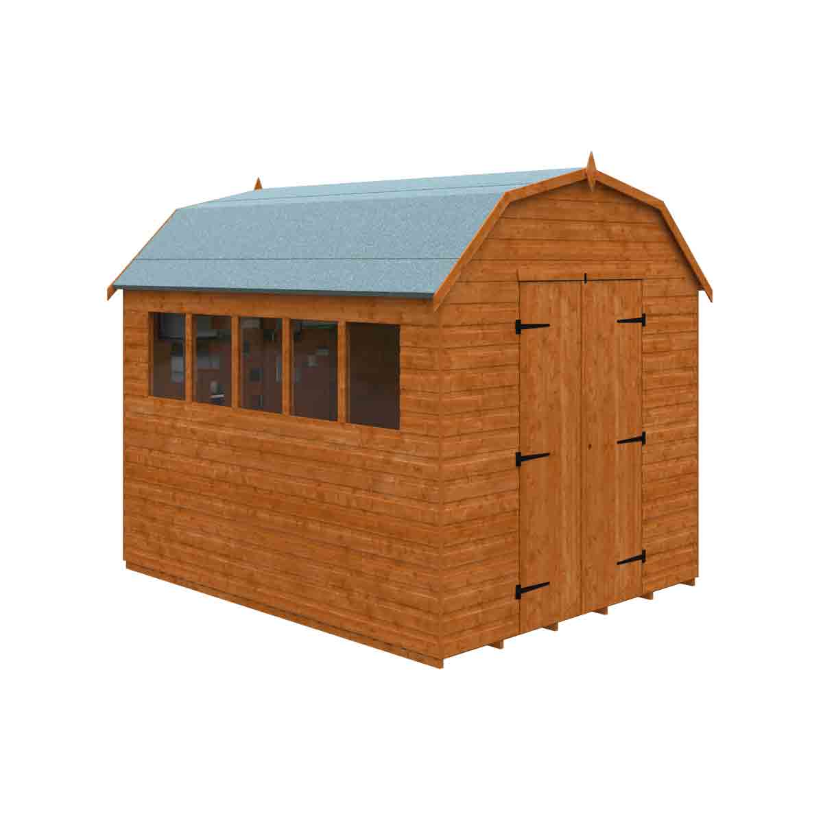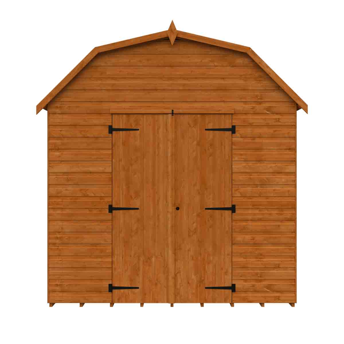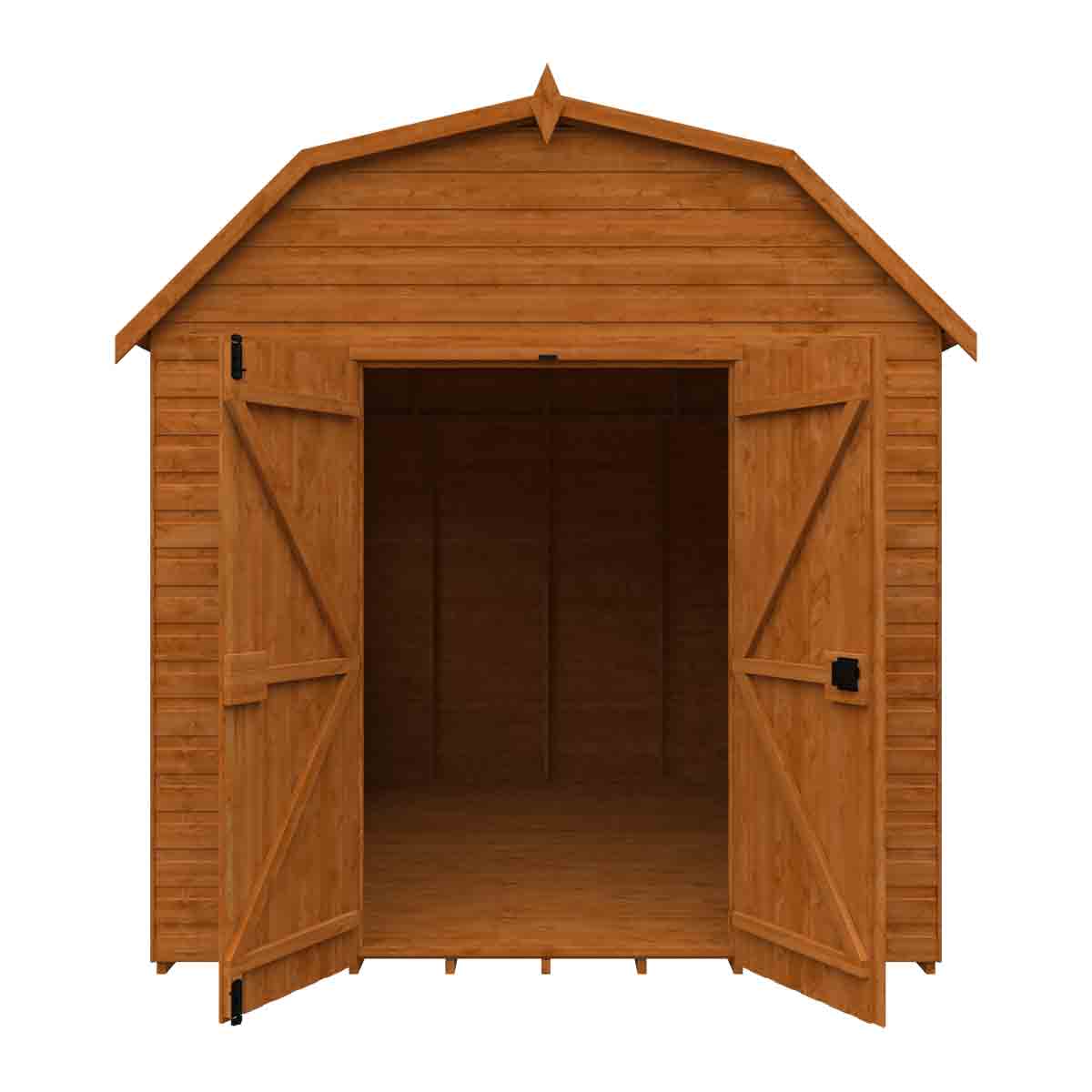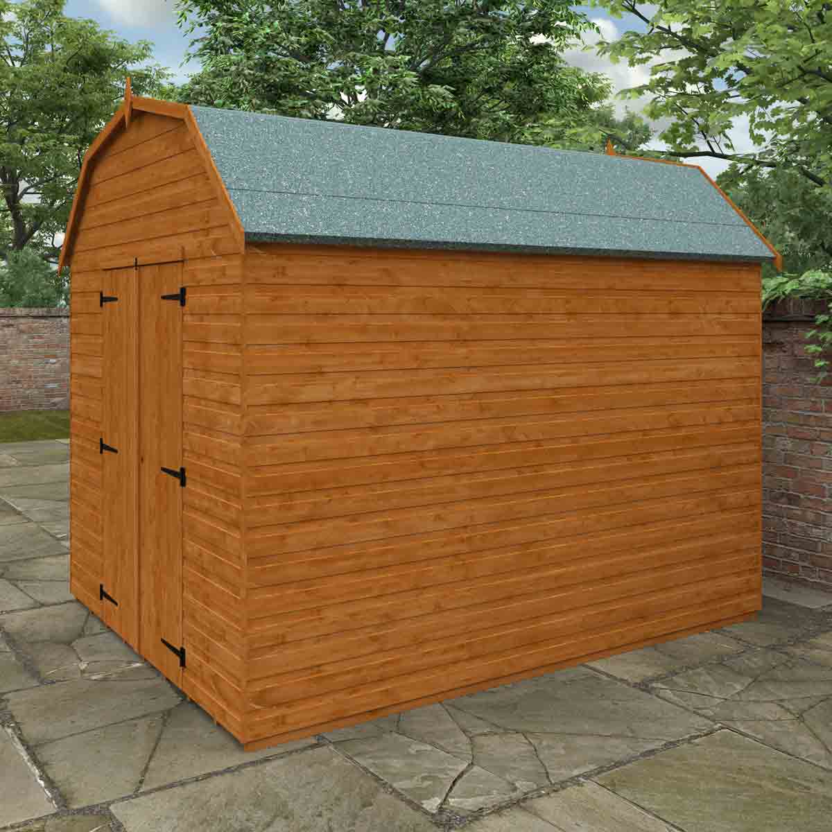 A unique building with an attractive and robust ‘Dutch-Barn’ style four-piece roof. Based on a Workshop height apex shed with double doors the Barn provides huge internal storage space, especially in the eaves. You must ensure that this garden building is assembled strictly in accordance with the assembly instructions that are provided and is installed on a firm and level base constructed from a suitably durable material. The garden building should be treated shortly after assembly, both externally and internally, with a good quality wood preserver and treated with a water-resistant treatment. Treatment should be reapplied annually to prolong the life of your building. All glazing units must be sealed, inside and out with silicone or other watertight solution of your choice (not supplied). Images and photos of products are provided for illustrative purposes only. Please note that product colours can vary slightly due to the digital photography process and variations in individual user monitor settings.