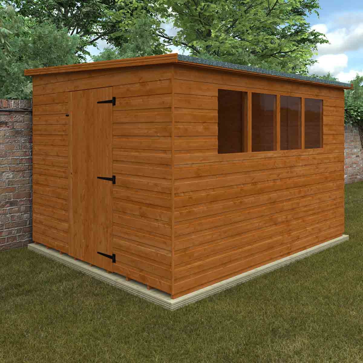 The Shiplap Lean To Pent shed is a popular variation of the classic styled pent shed, with the door in the gable end. Rest assured that the building meets our highest quality standards and comes in 12mm finished shiplap tongue and groove cladding. Also supplied with the shed is a lock and key as standard for added security. The benefits of our Lean-To sheds are the extra high eaves, allowing maximum storage to be achieved in the minimum of space. Added with this is the rounded and finished framework (28x44mm) giving strength and a quality finish to this Lean To Pent Shed. Supplied as standard is heavy duty black mineral roofing felt for additional durability. All fixings for construction and the necessary glazing are provided as well