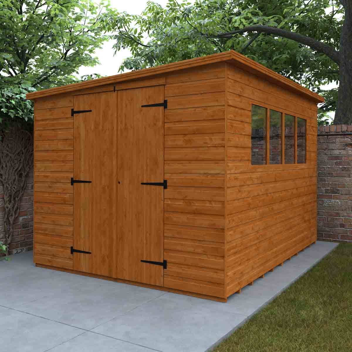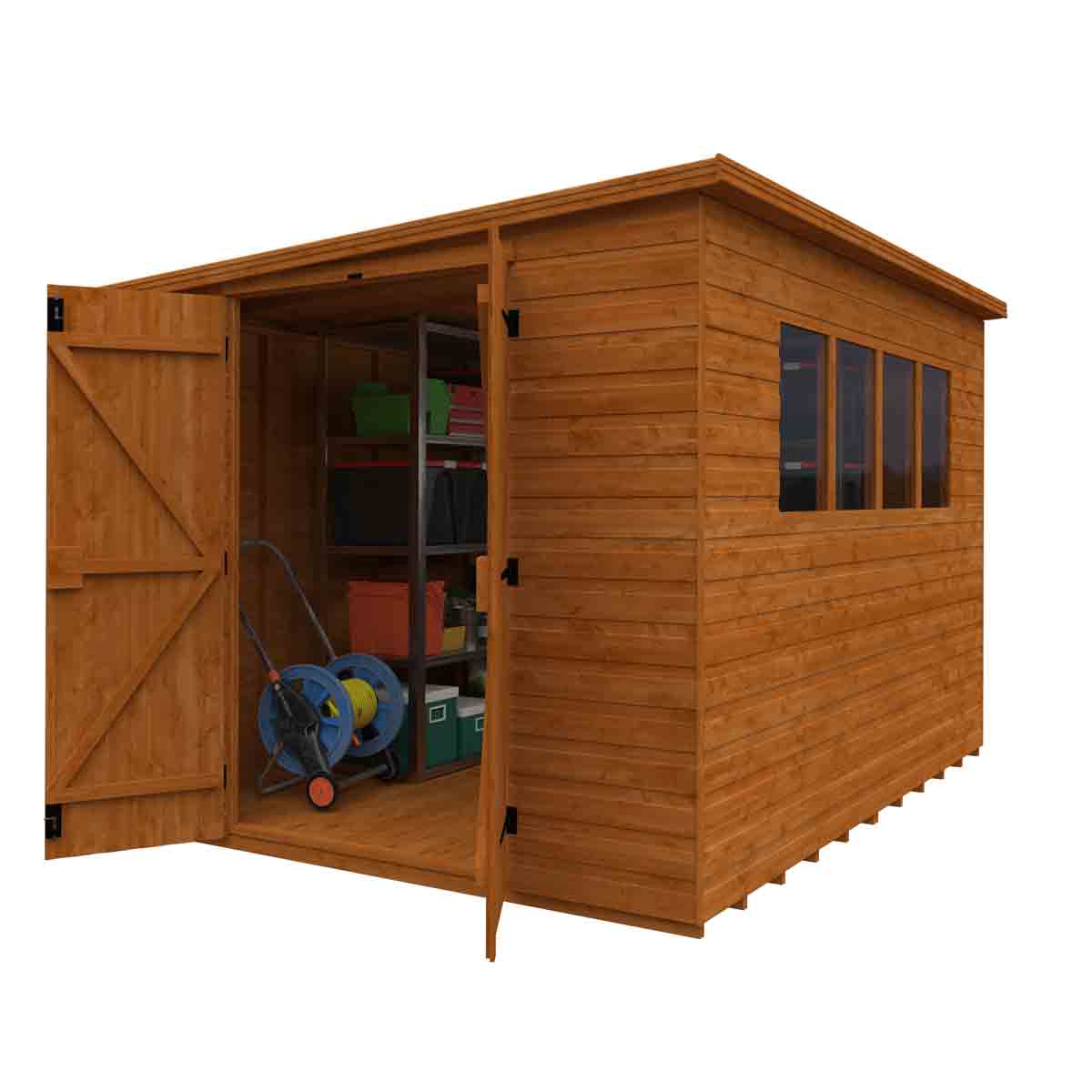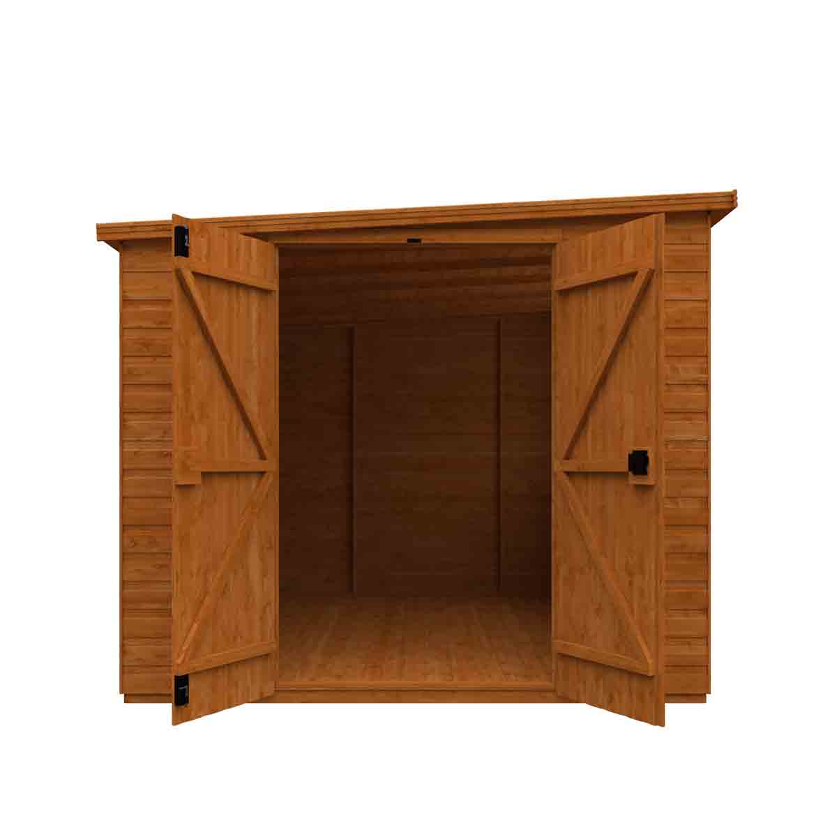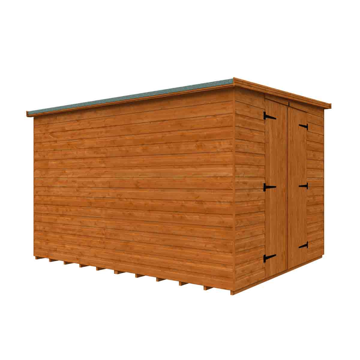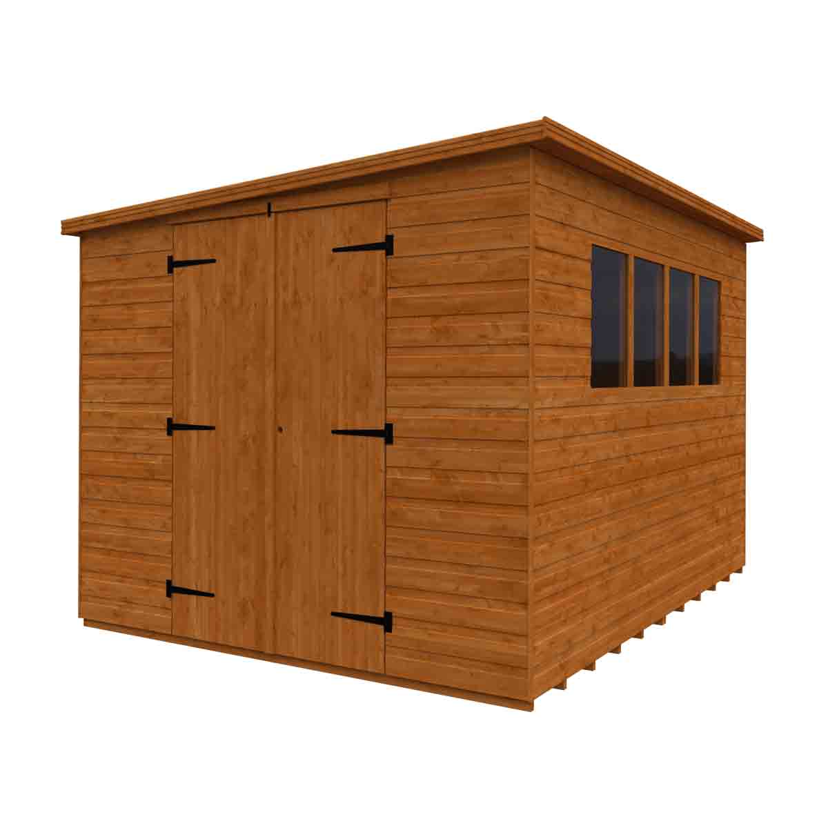 The Pent Workshop wooden shed provides a practical solution for those seeking extra outdoor workspace or additional storage space. It comes in various spacious sizes, all benefiting from elevated eaves height, making it a versatile choice for outdoor applications. The shed's high-quality tongue and groove shiplap cladding not only enhance its structural stability and security but also contribute to the overall quality of this garden shed. The 12mm finished cladding panels are crafted from carefully selected European softwood and treated with a protective water-based treatment for durability. For added protection, the roof of the Pent Workshop is covered with heavy-duty grey mineral felt. Internally, the shed features a sturdy rounded four-corner framework and a robust roof truss (found in models measuring 10x8 and larger), further enhancing its structural integrity. The Pent Workshop is designed with large full-height double doors offering convenient access and robust, durable construction. This shed is designed for long-lasting use.