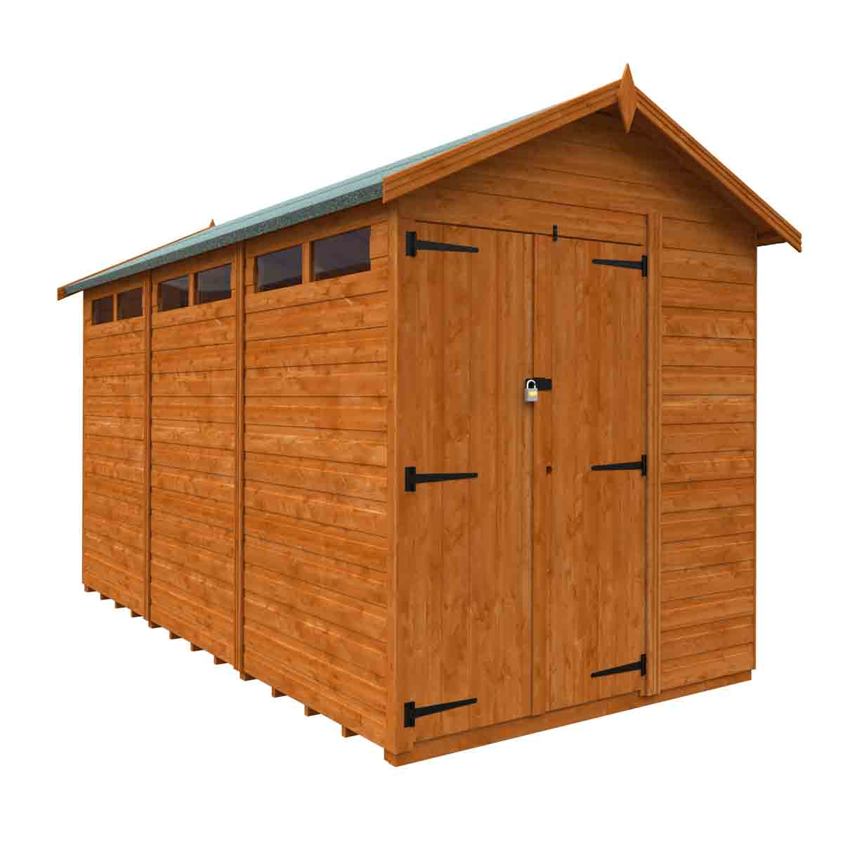 A double door version of our popular Modular Apex Security Shed! Featuring narrow security windows and hasp, staple and padlock to secure the double doors, this shed is the perfect secure storage solution for your garden space. The modular design allows you to place the doors and windows in the most secure position for your peace of mind. You must ensure that this garden building is assembled strictly in accordance with the assembly instructions that are provided and is installed on a firm and level base constructed from a suitably durable material. The garden building should be treated shortly after assembly, both externally and internally, with a good quality wood preserver and treated with a water-resistant treatment. Treatment should be reapplied annually to prolong the life of your building. All glazing units must be sealed, inside and out with silicone or other watertight solution of your choice (not supplied). Images and photos of products are provided for illustrative purposes only. Please note that product colours can vary slightly due to the digital photography process and variations in individual user monitor settings.