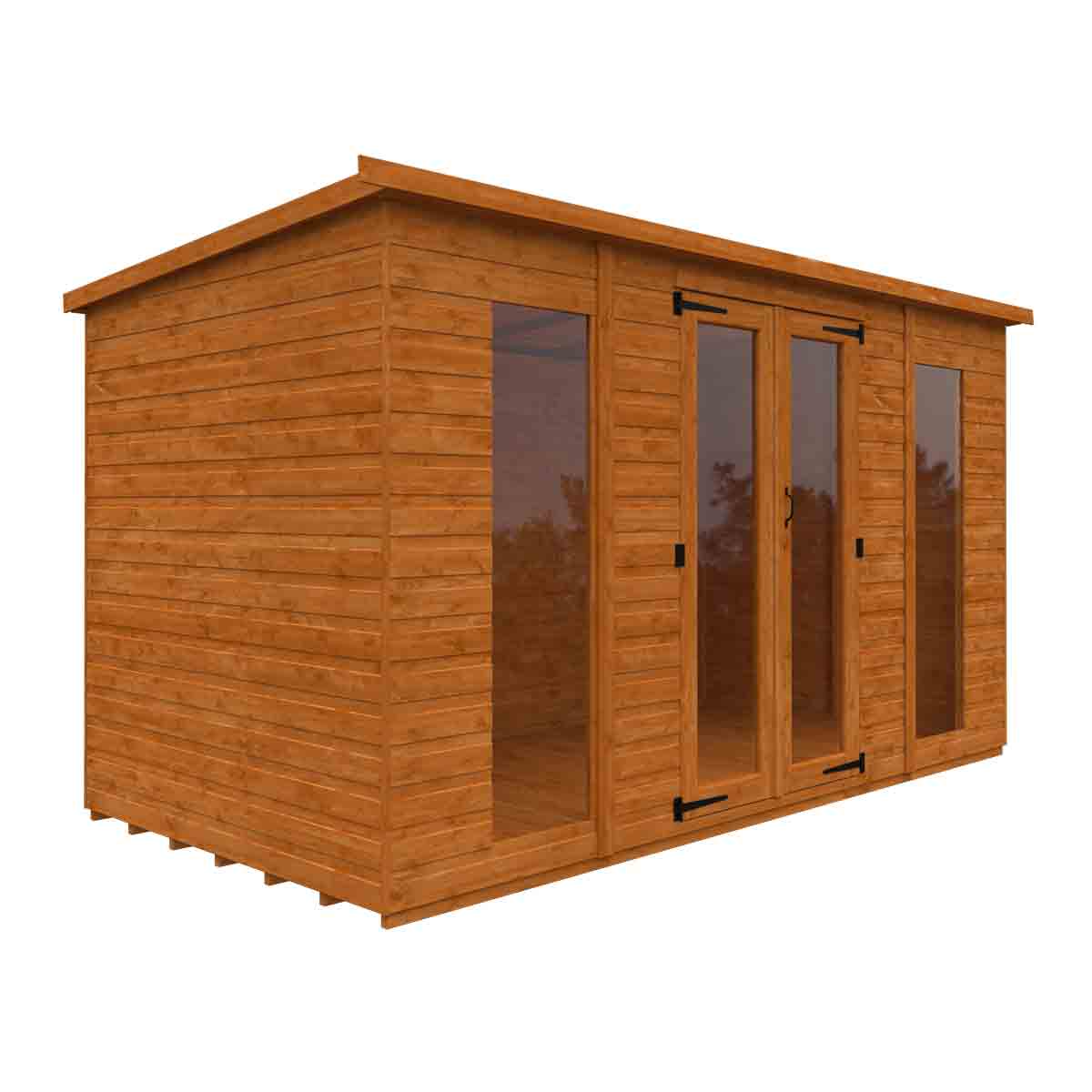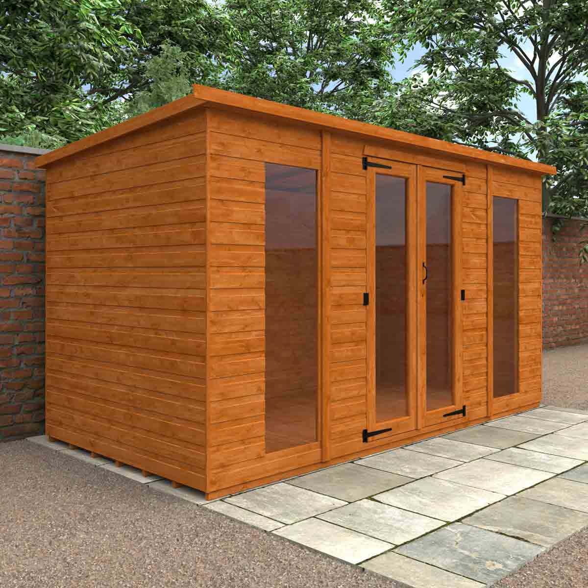 Combining impressive size, an attractive design featuring full pane double doors and full length full pane windows, and finished to our high standards, the Full Pane Workman Apex is a stunning building that is sure to look picture-perfect in any garden space. This stylish building is versatile enough to be enjoyed as a summerhouse, a workshop or even as a home office!You must ensure that this garden building is assembled strictly in accordance with the assembly instructions that are provided and is installed on a firm and level base constructed from a suitably durable material. The garden building should be treated shortly after assembly, both externally and internally, with a good quality wood preserver and treated with a water-resistant treatment. Treatment should be reapplied annually to prolong the life of your building. All glazing units must be sealed, inside and out with silicone or other watertight solution of your choice (not supplied). Images and photos of products are provided for illustrative purposes only. Please note that product colours can vary slightly due to the digital photography process and variations in individual user monitor settings.