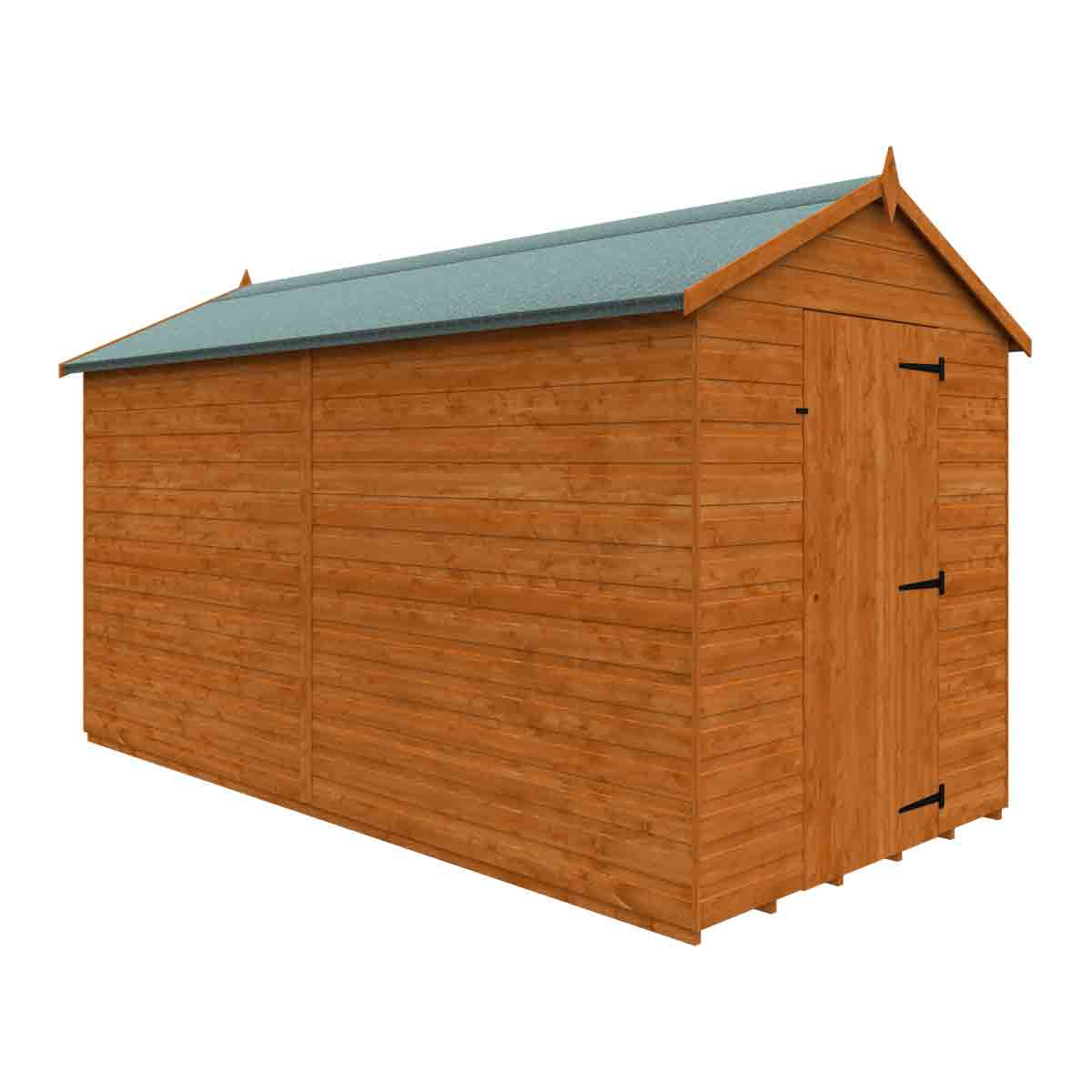 A traditional style garden shed with plenty of light and headroom in a vast range of sizes. The door will go on either end for flexibility. You must ensure that this garden building is assembled strictly in accordance with the assembly instructions that are provided and is installed on a firm and level base constructed from a suitably durable material. The garden building should be treated shortly after assembly, both externally and internally, with a good quality wood preserver and treated with a water-resistant treatment. Treatment should be reapplied annually to prolong the life of your building. All glazing units must be sealed, inside and out with silicone or other watertight solution of your choice (not supplied). Images and photos of products are provided for illustrative purposes only. Please note that product colours can vary slightly due to the digital photography process and variations in individual user monitor settings.