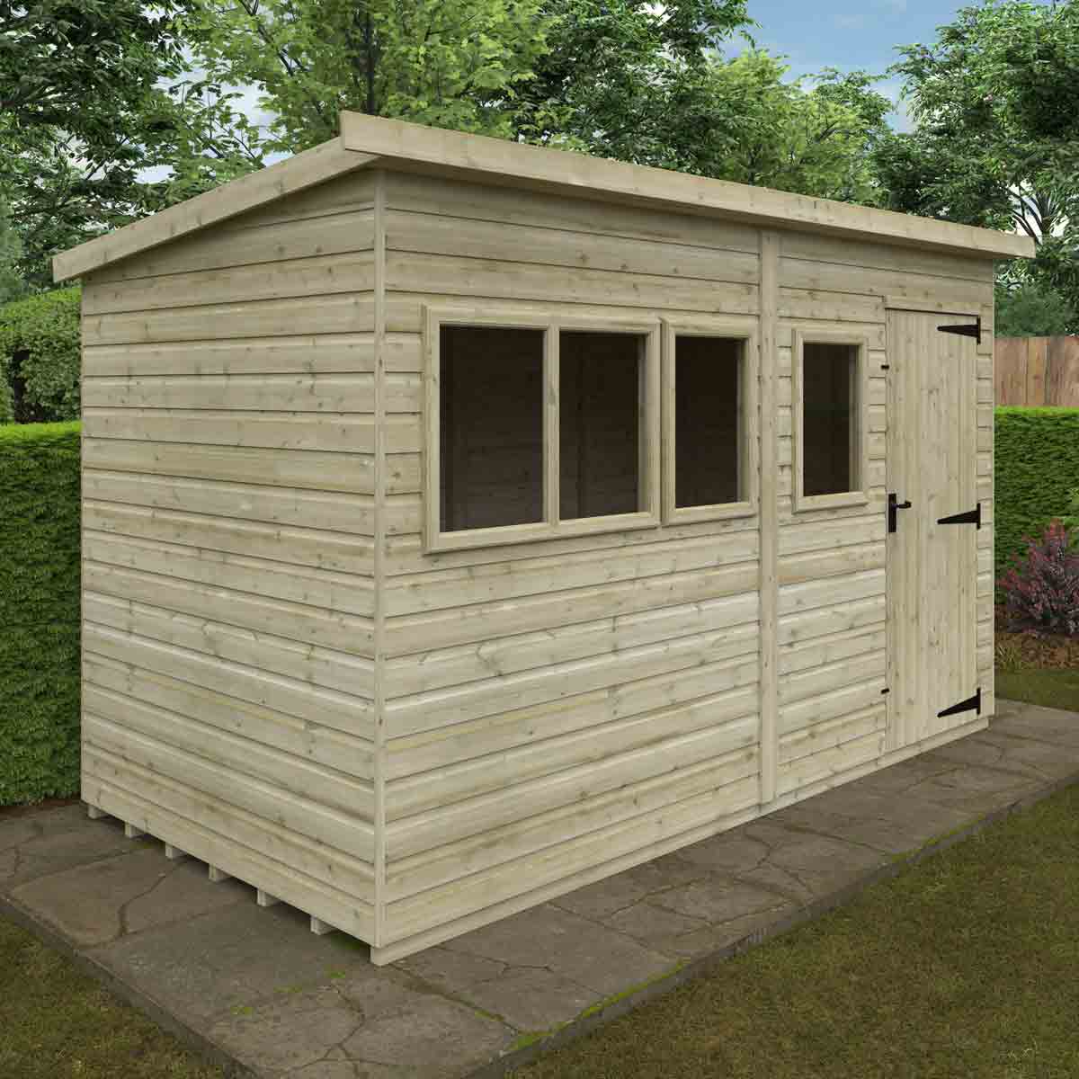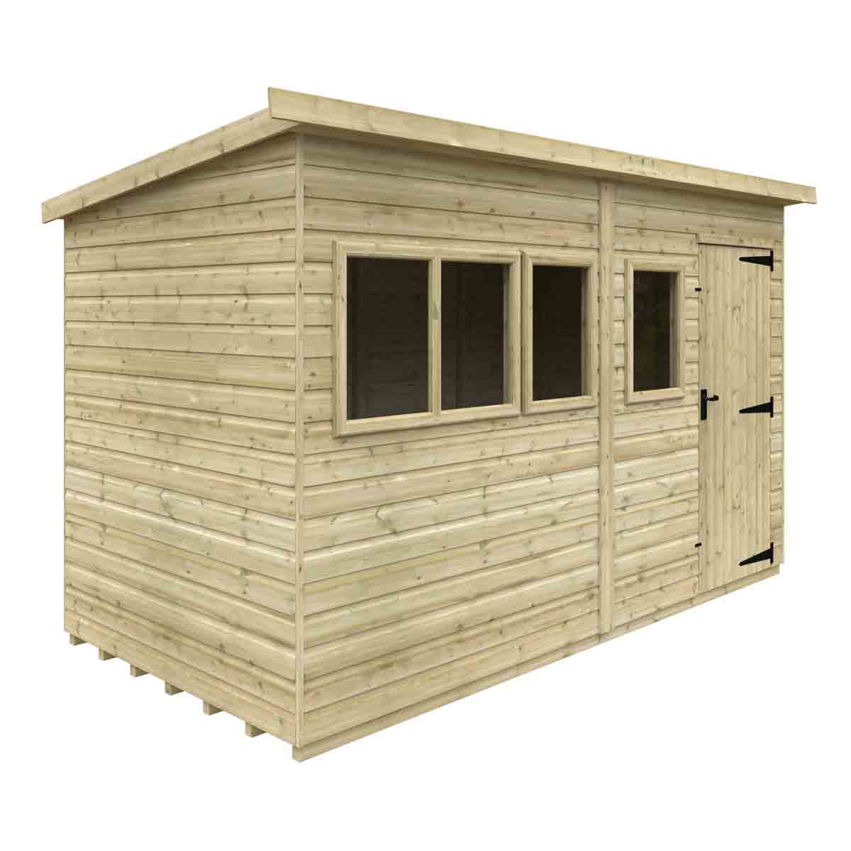 Based on the popular pent building this pressure treated version has thicker cladding and framing and comes as standard with joiner made windows and doors making it the ultimate pent shed. You must ensure that this garden building is assembled strictly in accordance with the assembly instructions that are provided and is installed on a firm and level base constructed from a suitably durable material. The garden building should be treated shortly after assembly, both externally and internally, with a good quality water-resistant treatment. Treatment should be reapplied annually to prolong the life of your building. All glazing units must be sealed, inside and out with silicone or other watertight solution of your choice (not supplied). Images and photos of products are provided for illustrative purposes only. Please note that product colours can vary slightly due to the digital photography process and variations in individual user monitor settings.