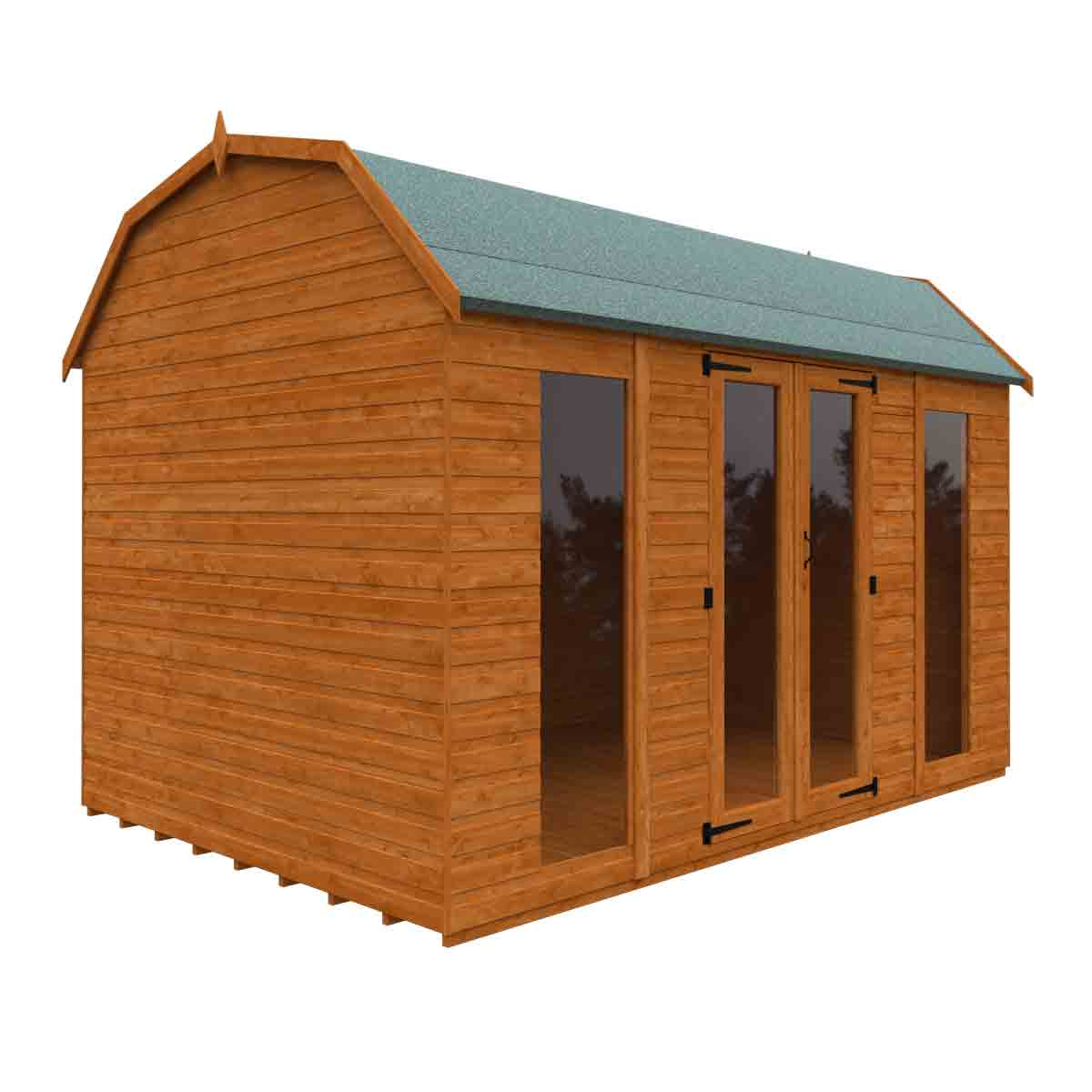 The Full Pane Barn Roof Summerhouse is a stylish and spacious garden escape, featuring a distinctive barn-style roof for added headroom and an airy feel. Crafted in our Yorkshire workshop from premium materials, its elegant full-pane toughened glass front makes it perfect for entertaining, relaxing, or working from home. Available in a range of sizes, it’s designed to be your ideal garden space.Built for durability, it boasts superior tongue and groove shiplap cladding, a strong boarded roof and floor, and large toughened glass windows. Double doors ensure easy access, while a secure lock-and-key system adds peace of mind. Complete with heavy-duty roofing felt for all-weather protection, this barn summerhouse is a stunning and practical addition to any outdoor space.