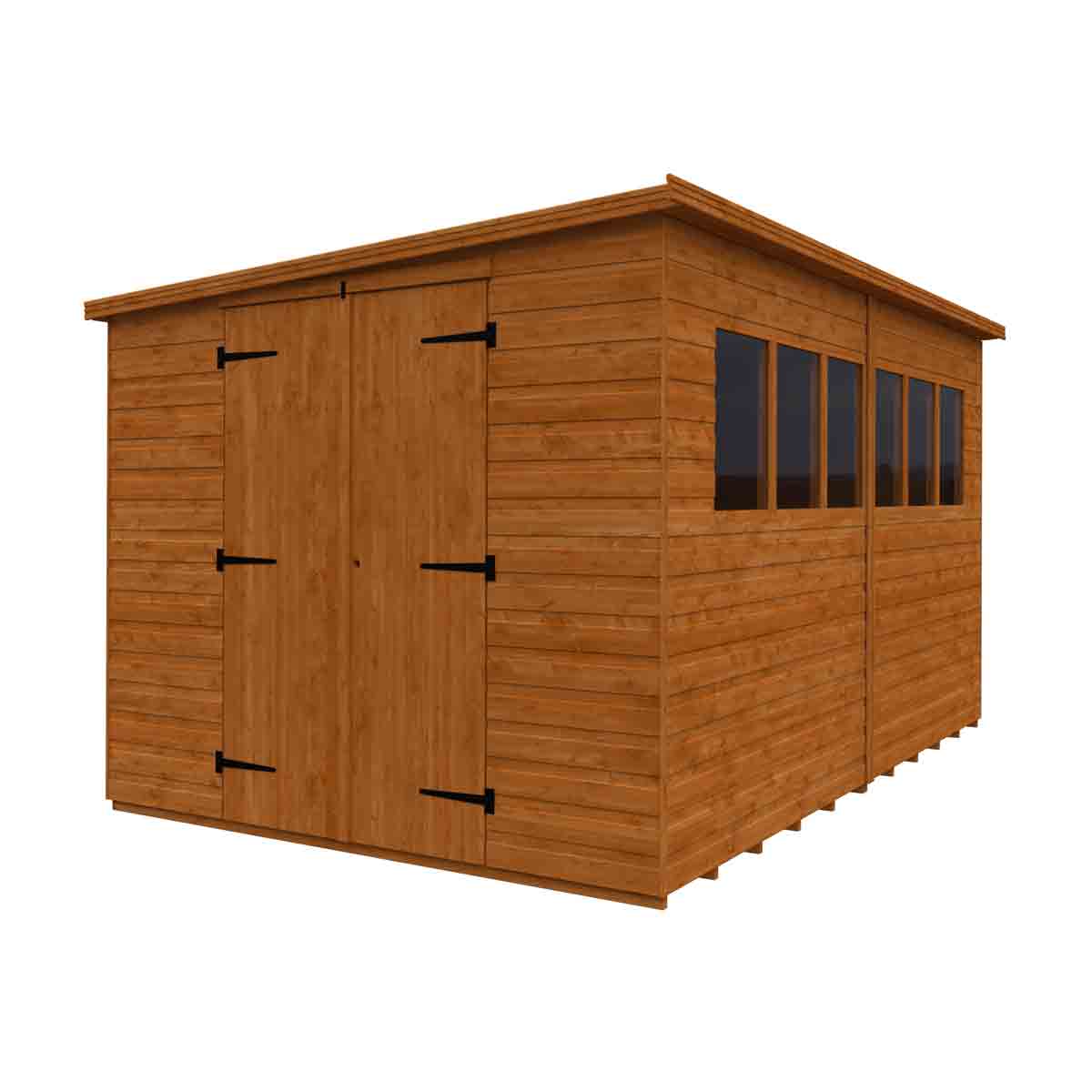 The Pent Workshop wooden shed provides a practical solution for those seeking extra outdoor workspace or additional storage space. It comes in various spacious sizes, all benefiting from elevated eaves height, making it a versatile choice for outdoor applications. The shed's high-quality tongue and groove shiplap cladding not only enhance its structural stability and security but also contribute to the overall quality of this garden shed. The 12mm finished cladding panels are crafted from carefully selected European softwood and treated with a protective water-based treatment for durability. For added protection, the roof of the Pent Workshop is covered with heavy-duty grey mineral felt. Internally, the shed features a sturdy rounded four-corner framework and a robust roof truss (found in models measuring 10x8 and larger), further enhancing its structural integrity. The Pent Workshop is designed with large full-height double doors offering convenient access and robust, durable construction. This shed is designed for long-lasting use.