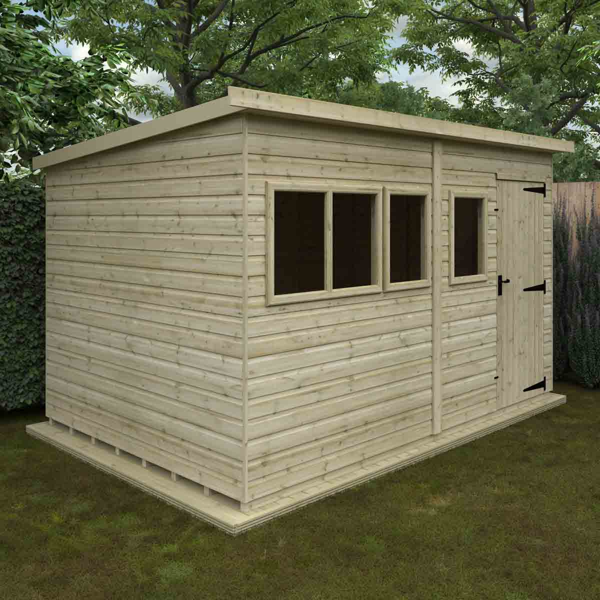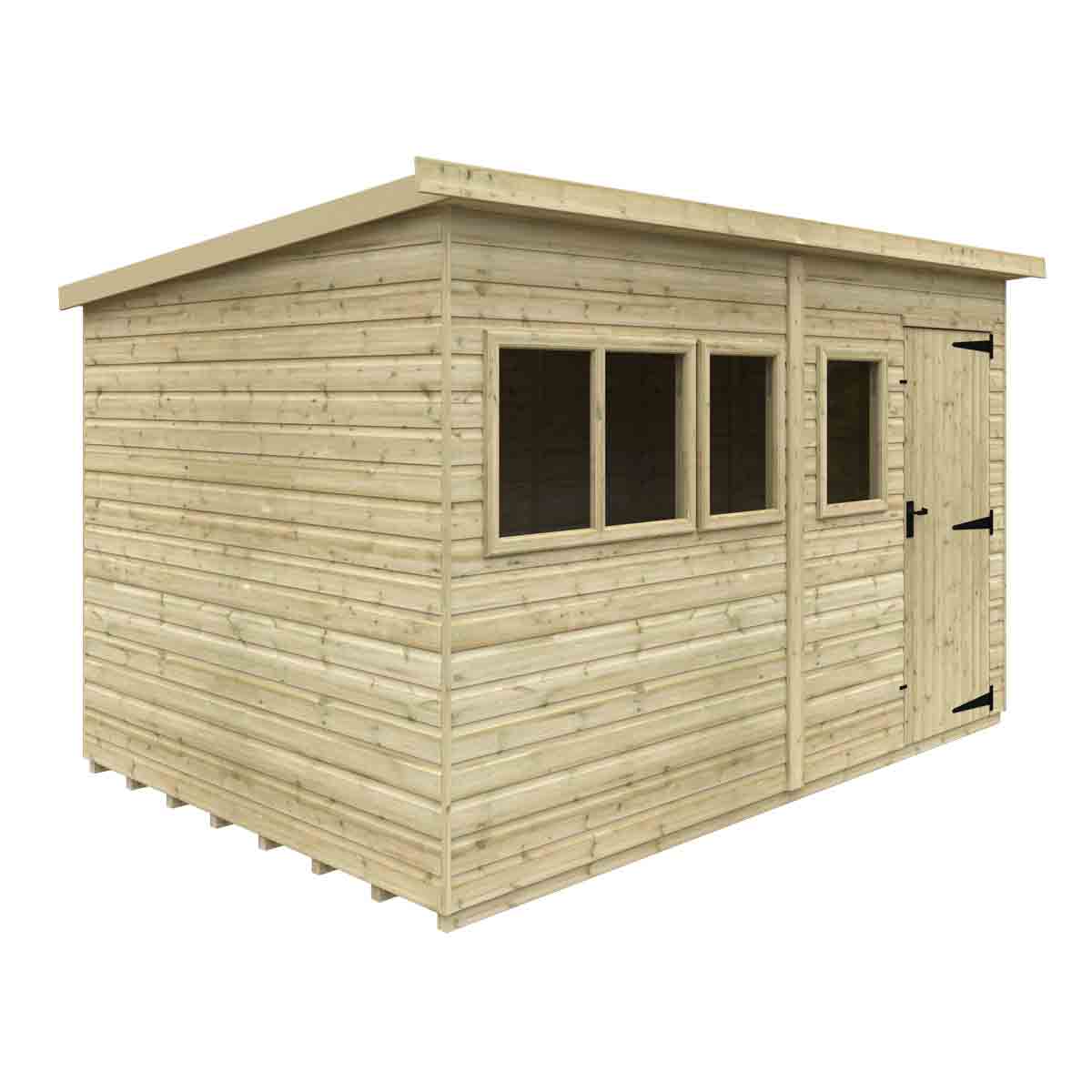 Based on the popular pent building this pressure treated version has thicker cladding and framing and comes as standard with joiner made windows and doors making it the ultimate pent shed. You must ensure that this garden building is assembled strictly in accordance with the assembly instructions that are provided and is installed on a firm and level base constructed from a suitably durable material. The garden building should be treated shortly after assembly, both externally and internally, with a good quality water-resistant treatment. Treatment should be reapplied annually to prolong the life of your building. All glazing units must be sealed, inside and out with silicone or other watertight solution of your choice (not supplied). Images and photos of products are provided for illustrative purposes only. Please note that product colours can vary slightly due to the digital photography process and variations in individual user monitor settings.