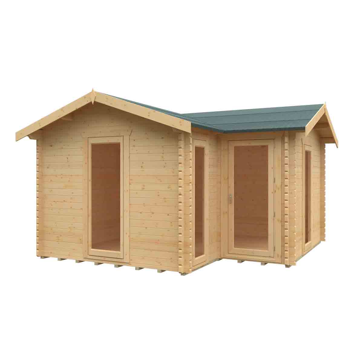 The increasingly popular L-shape design makes this Log Cabin a smart choice for maximizing a corner space. Its unique structure allows it to fit seamlessly into your garden, creating a stunning outdoor space. Whether placed near a pond, pool, or simply positioned to enjoy multiple garden views, the L-Shaped Cabin is perfect for entertaining, relaxing, or working from home. Crafted from high-grade 44mm interlocking logs, this cabin offers exceptional strength, security, and durability. The stylish front features European-style fully glazed double doors, complete with elegant handles and a high-security 3-lever lock for peace of mind. Several joiner-made, draft-sealed, and key-lockable windows enhance both security and natural light, ensuring the cabin remains a bright and welcoming space all year round.