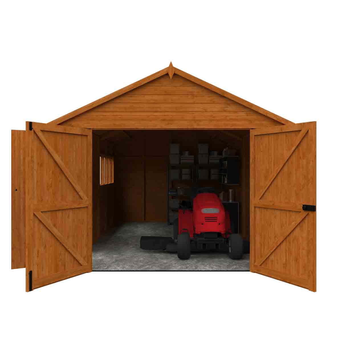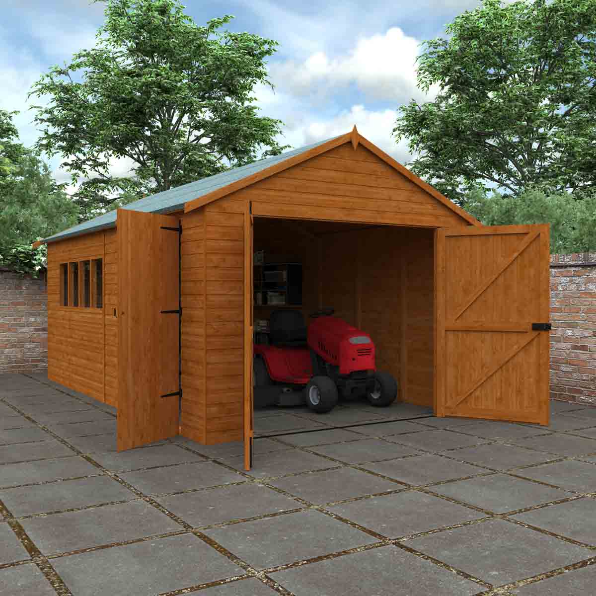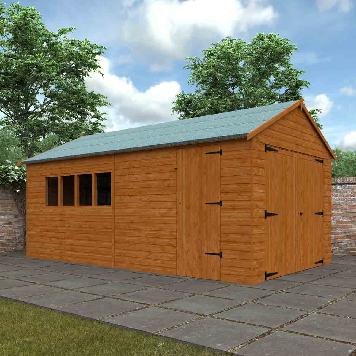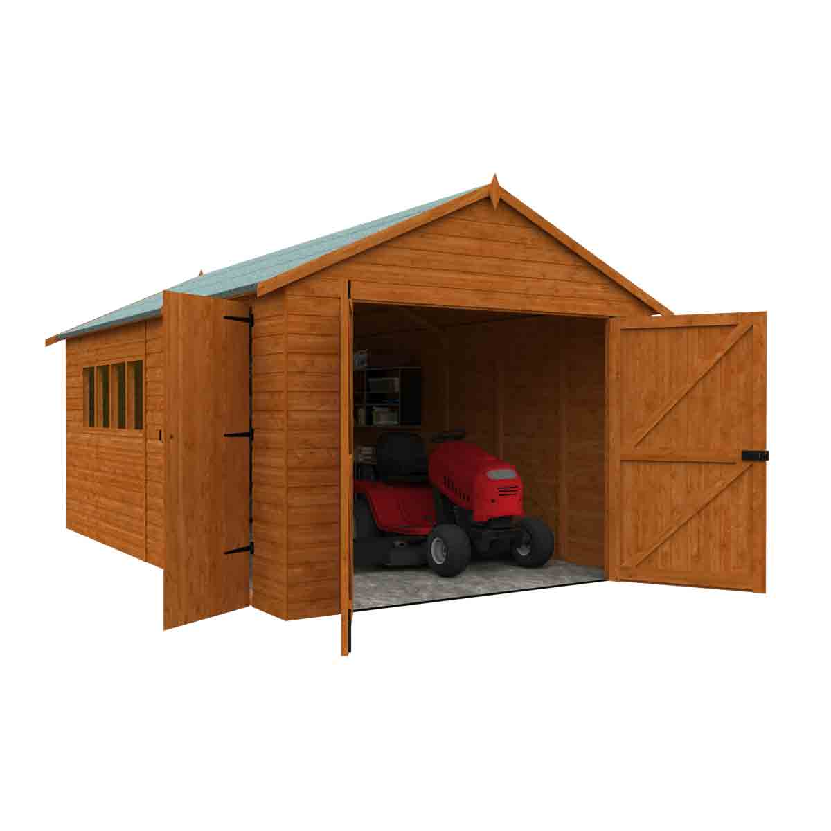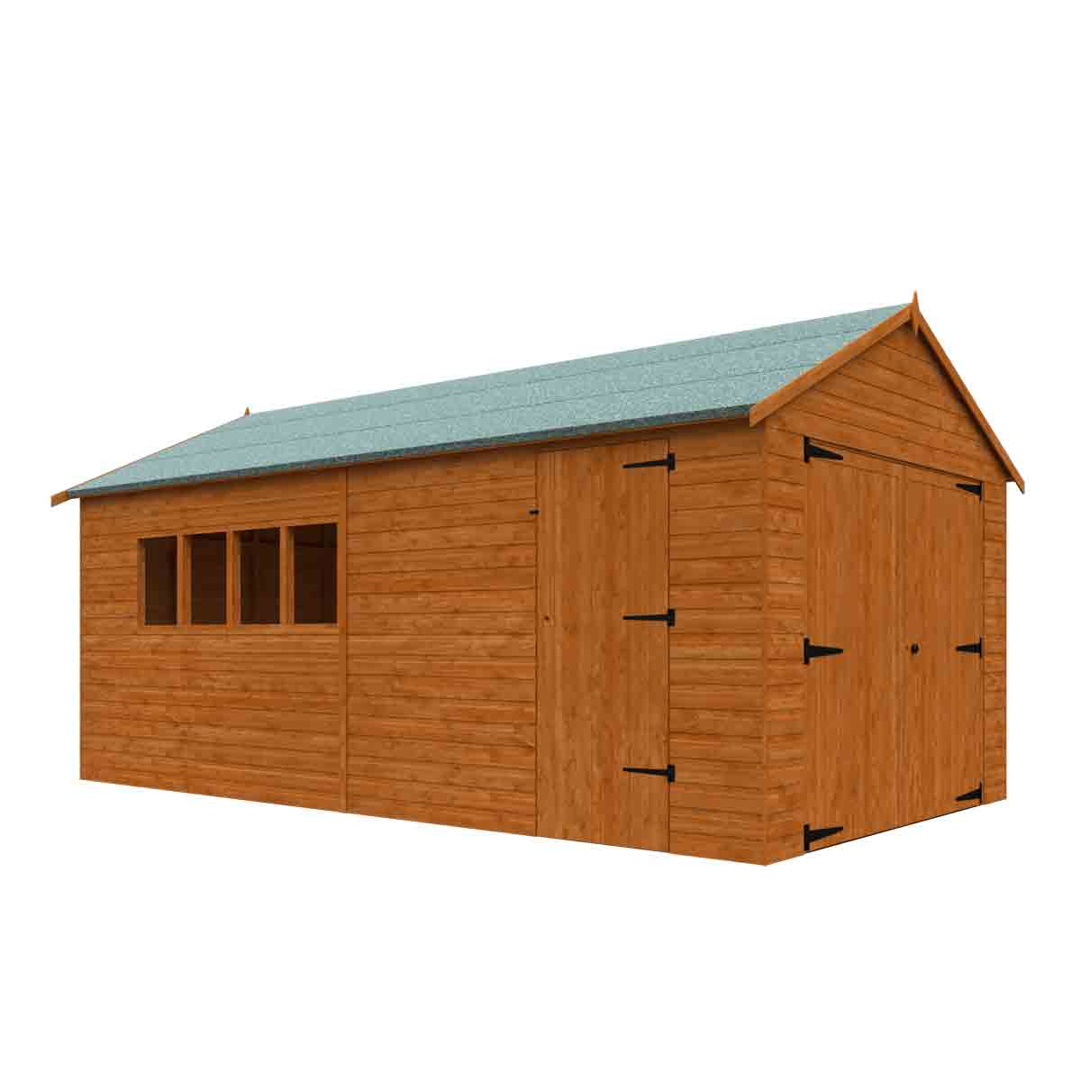 Our fantastic Garage style workshop sits directly onto your chosen base and the substantial Garage double doors make parking your vehicle an easy task. The Garage also comes with a personal side access door and no floor as standard. You must ensure that this garden building is assembled strictly in accordance with the assembly instructions that are provided and is installed on a firm and level base constructed from a suitably durable material. The garden building should be treated shortly after assembly, both externally and internally, with a good quality wood preserver and treated with a water-resistant treatment. Treatment should be reapplied annually to prolong the life of your building. All glazing units must be sealed, inside and out with silicone or other watertight solution of your choice (not supplied). Images and photos of products are provided for illustrative purposes only. Please note that product colours can vary slightly due to the digital photography process and variations in individual user monitor settings.