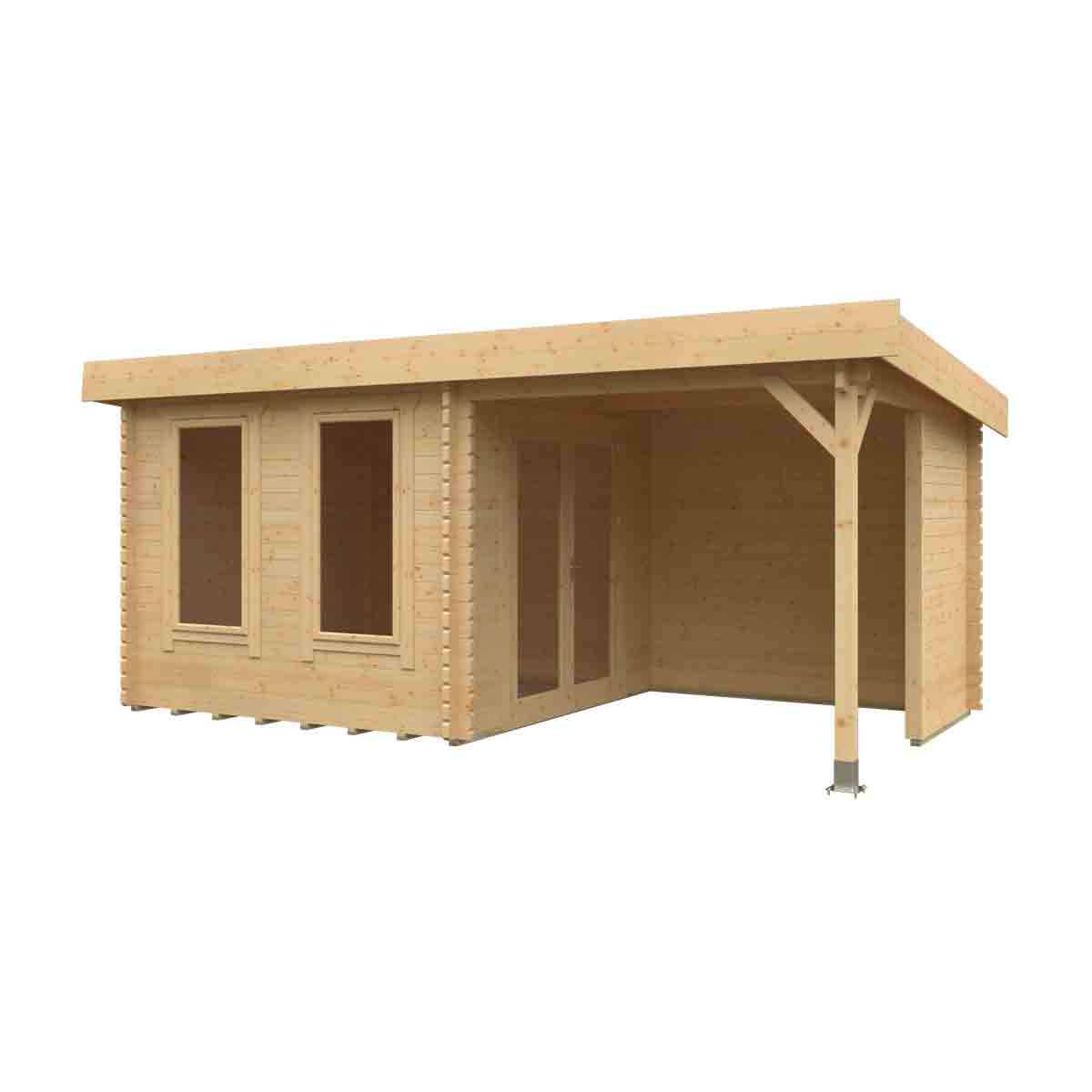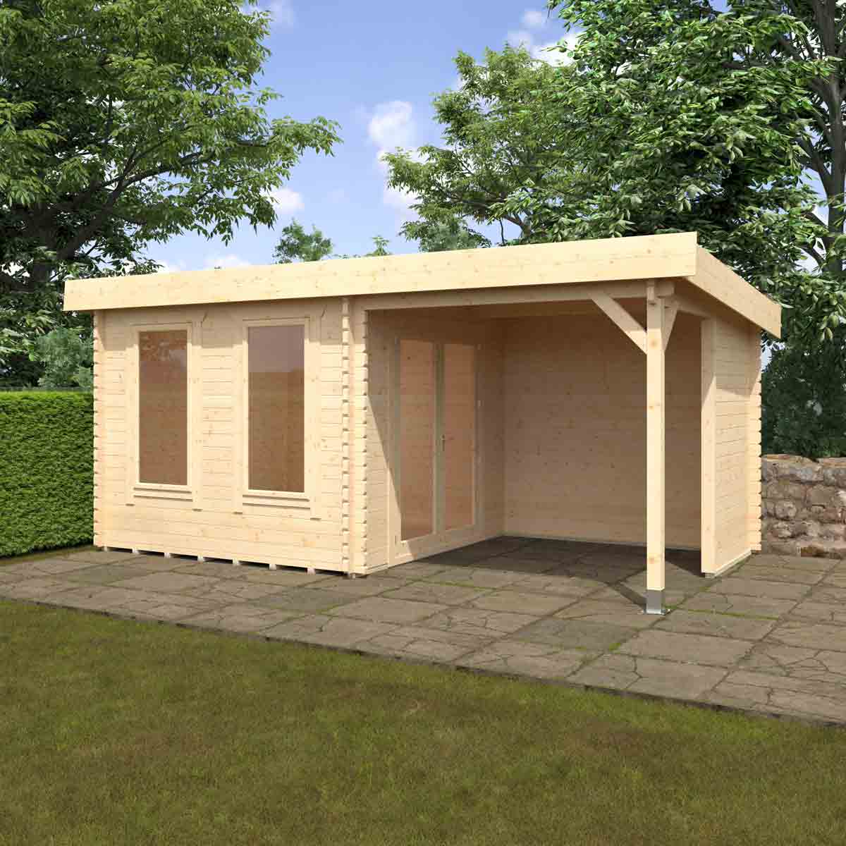 The Lulworth is a most spectacular and contemporary log cabin with alfresco relaxation area. It combines an exceptional indoor space with a practical outdoor shelter, perfect either as shade from the sun or an escape from summer showers, for you and your outdoor belongings. The full length toughened glass windows and doors take maximum advantage of the light available making it an ideal place to spend those lazy summer days. You must ensure that this garden building is assembled strictly in accordance with the assembly instructions that are provided and is installed on a firm and level base constructed from a suitably durable material. The garden building should be treated shortly after assembly, both externally and internally, with a good quality wood preserver and treated with a water-resistant treatment. Treatment should be reapplied annually to prolong the life of your building. Images and photos of products are provided for illustrative purposes only. Please note that product colours can vary slightly due to the digital photography process and variations in individual user monitor settings.