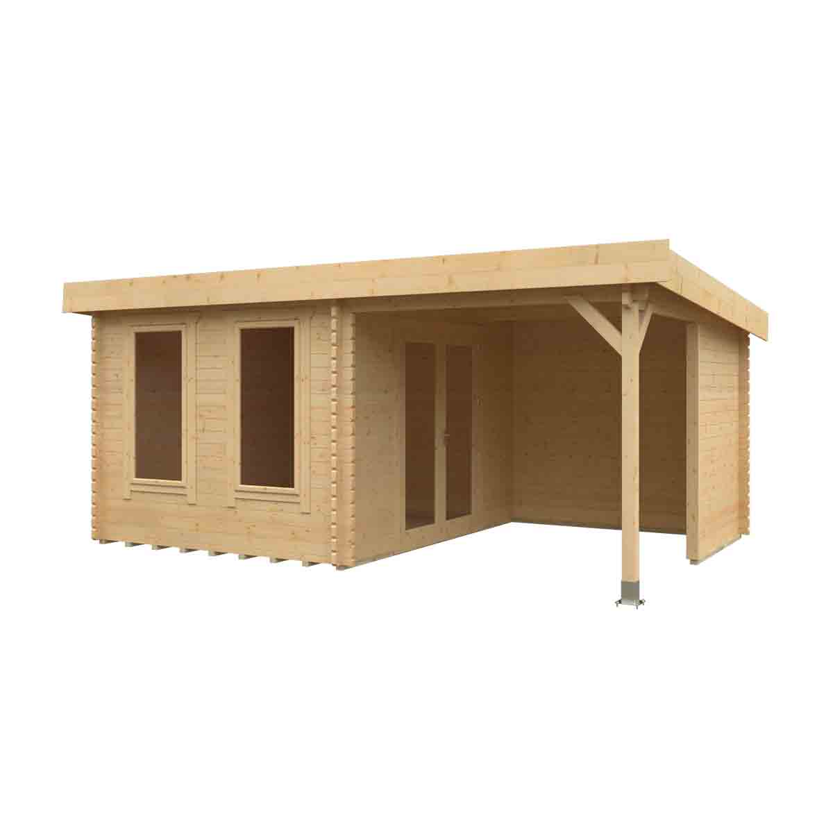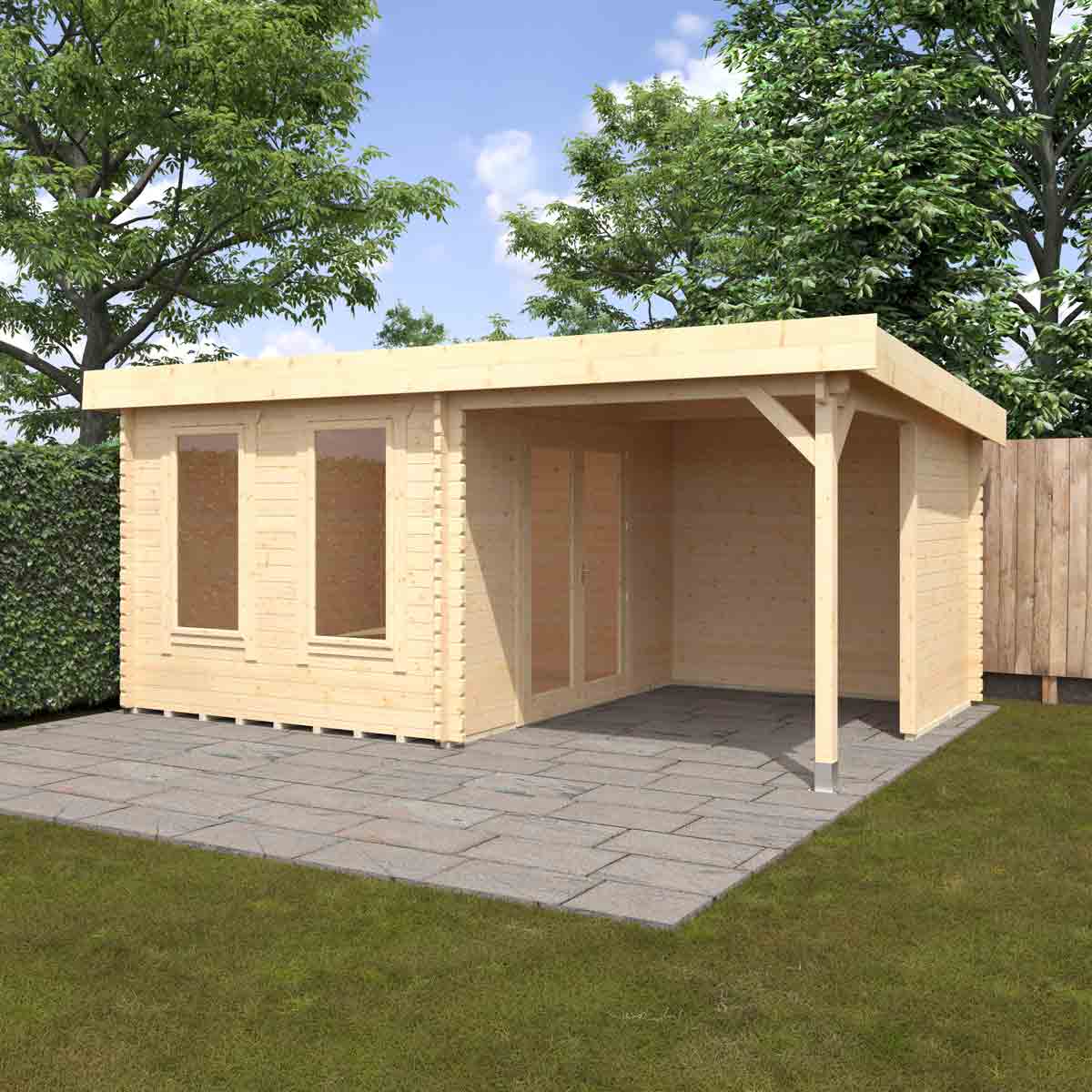 The Lulworth is a most spectacular and contemporary log cabin with alfresco relaxation area. It combines an exceptional indoor space with a practical outdoor shelter, perfect either as shade from the sun or an escape from summer showers, for you and your outdoor belongings. The full length toughened glass windows and doors take maximum advantage of the light available making it an ideal place to spend those lazy summer days. You must ensure that this garden building is assembled strictly in accordance with the assembly instructions that are provided and is installed on a firm and level base constructed from a suitably durable material. The garden building should be treated shortly after assembly, both externally and internally, with a good quality wood preserver and treated with a water-resistant treatment. Treatment should be reapplied annually to prolong the life of your building. Images and photos of products are provided for illustrative purposes only. Please note that product colours can vary slightly due to the digital photography process and variations in individual user monitor settings.
