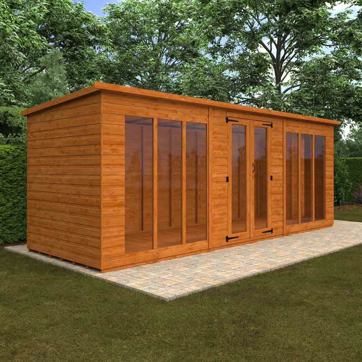 A delightful and stylish garden building, this full-pane workshop is meticulously crafted from top-quality materials and finished to our exacting standards. Available in eight sizes, this contemporary summerhouse combines elegant design with exceptional craftsmanship, making it the perfect garden room for any need. Featuring a sleek pent roof and full-pane doors and windows, the interior is flooded with natural light, creating a serene space for work or leisure. The wide double doors allow for easy access, while the robust pent roof is designed to withstand the unpredictable British weather. With ample internal space, it is ideal for enjoying sunny days with family and friends.Constructed with superior-grade tongue-and-groove shiplap cladding, as well as tongue-and-groove boards for the roof and floor, this summerhouse guarantees lasting strength and durability. The extra-high eaves enhance accessibility, and the toughened glazing, along with a secure lock and key system, ensures added peace of mind. Heavy-duty roofing felt comes standard, providing reliable weatherproof protection throughout the year, complemented by full-pane windows and expertly crafted joiner-made doors.