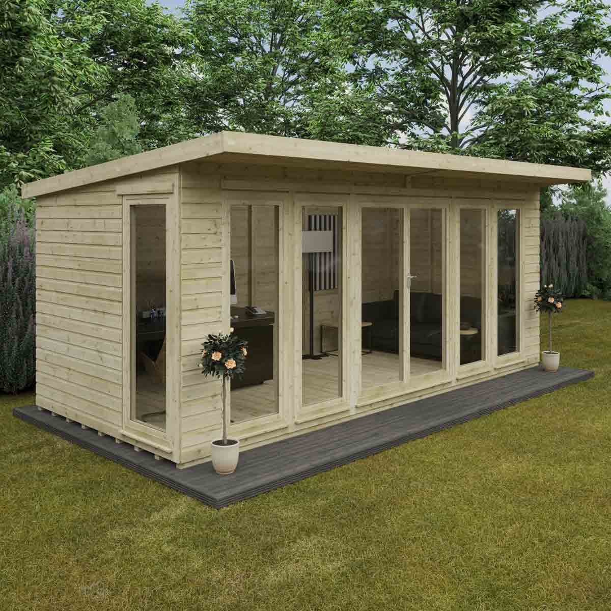 Give your garden a fresh new look with a Garden Studio – the ultimate garden office. Modern, stylish and yet practical.. The perfect trio for creating an inspiring work space and tranquil spot to unwind. You must ensure that this garden building is assembled strictly in accordance with the assembly instructions that are provided and is installed on a firm and level base constructed from a suitably durable material. The garden building should be treated shortly after assembly, both externally and internally, with a good quality water-resistant treatment. Treatment should be reapplied annually to prolong the life of your building. All glazing units must be sealed, inside and out with silicone or other watertight solution of your choice (not supplied). Images and photos of products are provided for illustrative purposes only. Please note that product colours can vary slightly due to the digital photography process and variations in individual user monitor settings.