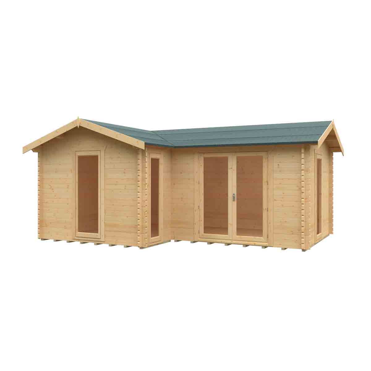The increasingly popular L-shape design makes this Log Cabin a smart choice for maximizing a corner space. Its unique structure allows it to fit seamlessly into your garden, creating a stunning outdoor space. Whether placed near a pond, pool, or simply positioned to enjoy multiple garden views, the L-Shaped Cabin is perfect for entertaining, relaxing, or working from home. Crafted from high-grade 44mm interlocking logs, this cabin offers exceptional strength, security, and durability. The stylish front features European-style fully glazed double doors, complete with elegant handles and a high-security 3-lever lock for peace of mind. Several joiner-made, draft-sealed, and key-lockable windows enhance both security and natural light, ensuring the cabin remains a bright and welcoming space all year round.