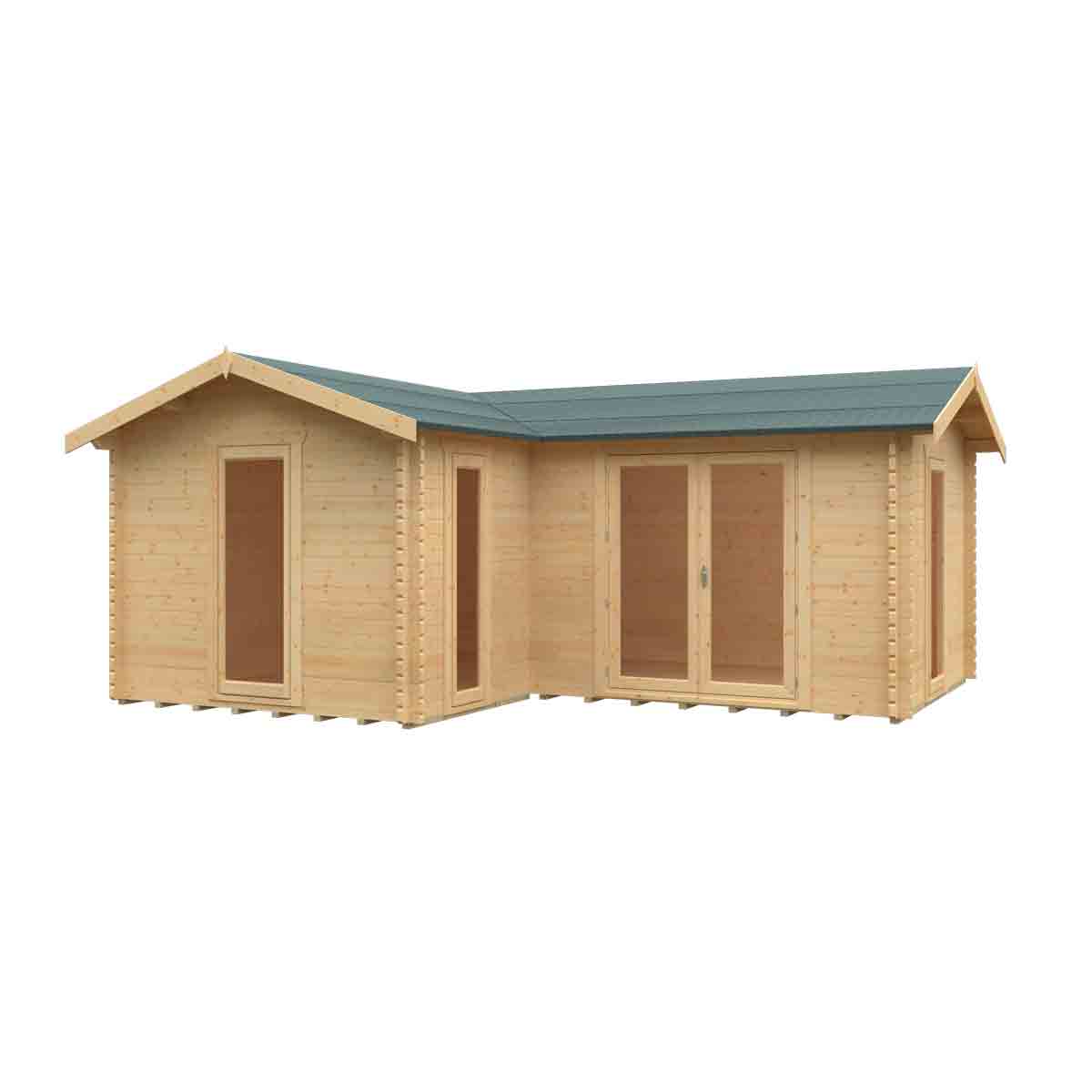 The increasingly popular L-shape design makes this Log Cabin a smart choice for maximizing a corner space. Its unique structure allows it to fit seamlessly into your garden, creating a stunning outdoor space. Whether placed near a pond, pool, or simply positioned to enjoy multiple garden views, the L-Shaped Cabin is perfect for entertaining, relaxing, or working from home. Crafted from high-grade 44mm interlocking logs, this cabin offers exceptional strength, security, and durability. The stylish front features European-style fully glazed double doors, complete with elegant handles and a high-security 3-lever lock for peace of mind. Several joiner-made, draft-sealed, and key-lockable windows enhance both security and natural light, ensuring the cabin remains a bright and welcoming space all year round.
