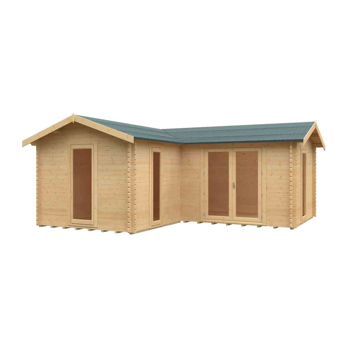 The increasingly popular L-shape design makes this Log Cabin a smart choice for maximizing a corner space. Its unique structure allows it to fit seamlessly into your garden, creating a stunning outdoor space. Whether placed near a pond, pool, or simply positioned to enjoy multiple garden views, the L-Shaped Cabin is perfect for entertaining, relaxing, or working from home. Crafted from high-grade 44mm interlocking logs, this cabin offers exceptional strength, security, and durability. The stylish front features European-style fully glazed double doors, complete with elegant handles and a high-security 3-lever lock for peace of mind. Several joiner-made, draft-sealed, and key-lockable windows enhance both security and natural light, ensuring the cabin remains a bright and welcoming space all year round.