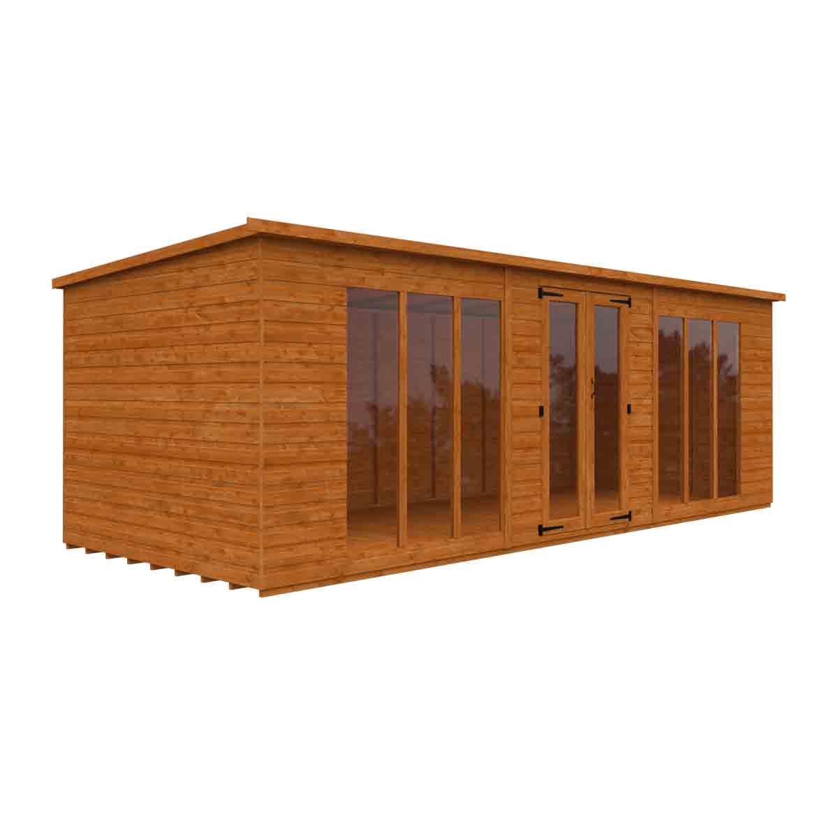 A delightful and stylish garden building, this full-pane workshop is meticulously crafted from top-quality materials and finished to our exacting standards. Available in eight sizes, this contemporary summerhouse combines elegant design with exceptional craftsmanship, making it the perfect garden room for any need. Featuring a sleek pent roof and full-pane doors and windows, the interior is flooded with natural light, creating a serene space for work or leisure. The wide double doors allow for easy access, while the robust pent roof is designed to withstand the unpredictable British weather. With ample internal space, it is ideal for enjoying sunny days with family and friends.Constructed with superior-grade tongue-and-groove shiplap cladding, as well as tongue-and-groove boards for the roof and floor, this summerhouse guarantees lasting strength and durability. The extra-high eaves enhance accessibility, and the toughened glazing, along with a secure lock and key system, ensures added peace of mind. Heavy-duty roofing felt comes standard, providing reliable weatherproof protection throughout the year, complemented by full-pane windows and expertly crafted joiner-made doors.