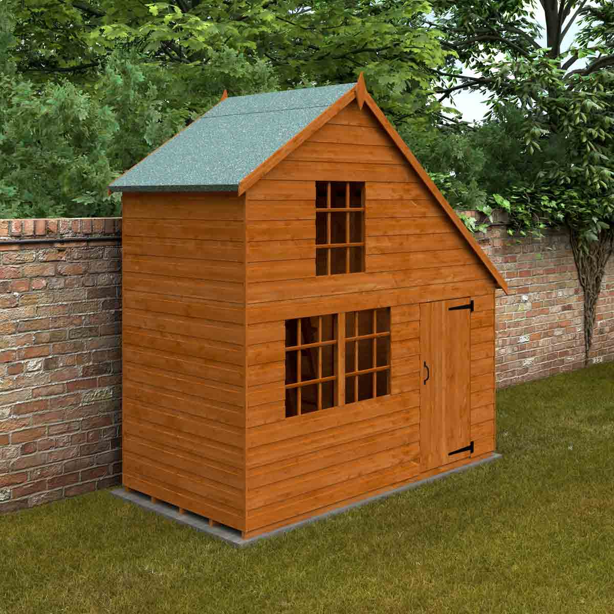 An impressive two-storey, detached playhouse, available in two widths. Image shows 8x6w model. You must ensure that this garden building is assembled strictly in accordance with the assembly instructions that are provided and is installed on a firm and level base constructed from a suitably durable material. The garden building should be treated shortly after assembly, both externally and internally, with a good quality wood preserver and treated with a water-resistant treatment. Treatment should be reapplied annually to prolong the life of your building. All glazing units must be sealed, inside and out with silicone or other watertight solution of your choice (not supplied). Images and photos of products are provided for illustrative purposes only. Please note that product colours can vary slightly due to the digital photography process and variations in individual user monitor settings.