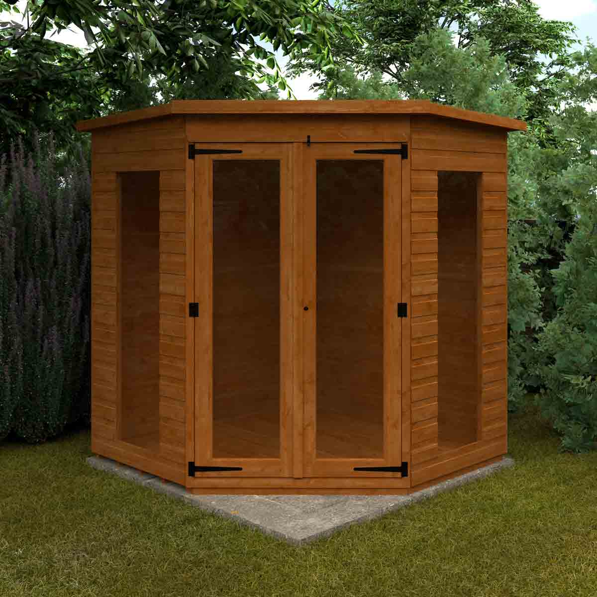 The Full Pane Corner Summerhouse is both modern and elegant, suiting a variety of gardens. The design makes it well suited to the corner of your garden, allowing you to save space whilst enjoying the view. The full pane double doors and windows allow in maximum light and provide an excellent panoramic view of your green space. You must ensure that this garden building is assembled strictly in accordance with the assembly instructions that are provided and is installed on a firm and level base constructed from a suitably durable material. The garden building should be treated shortly after assembly, both externally and internally, with a good quality wood preserver and treated with a water-resistant treatment. Treatment should be reapplied annually to prolong the life of your building. Images and photos of products are provided for illustrative purposes only. Please note that product colours can vary slightly due to the digital photography process and variations in individual user monitor settings.