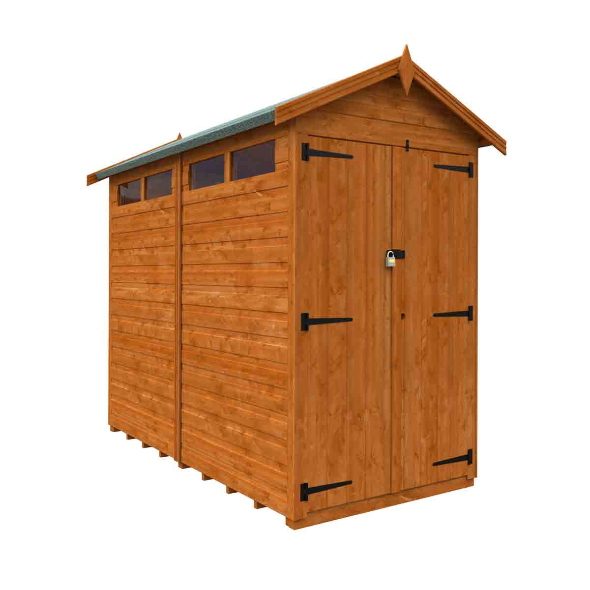 A double door version of our popular Modular Apex Security Shed! Featuring narrow security windows and hasp, staple and padlock to secure the double doors, this shed is the perfect secure storage solution for your garden space. The modular design allows you to place the doors and windows in the most secure position for your peace of mind. You must ensure that this garden building is assembled strictly in accordance with the assembly instructions that are provided and is installed on a firm and level base constructed from a suitably durable material. The garden building should be treated shortly after assembly, both externally and internally, with a good quality wood preserver and treated with a water-resistant treatment. Treatment should be reapplied annually to prolong the life of your building. All glazing units must be sealed, inside and out with silicone or other watertight solution of your choice (not supplied). Images and photos of products are provided for illustrative purposes only. Please note that product colours can vary slightly due to the digital photography process and variations in individual user monitor settings.