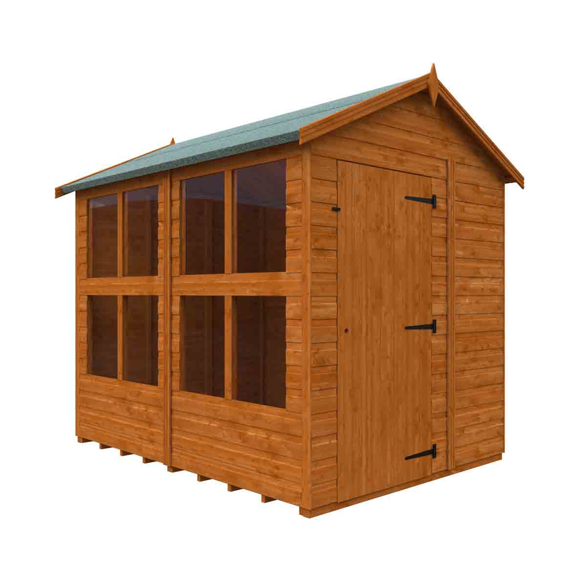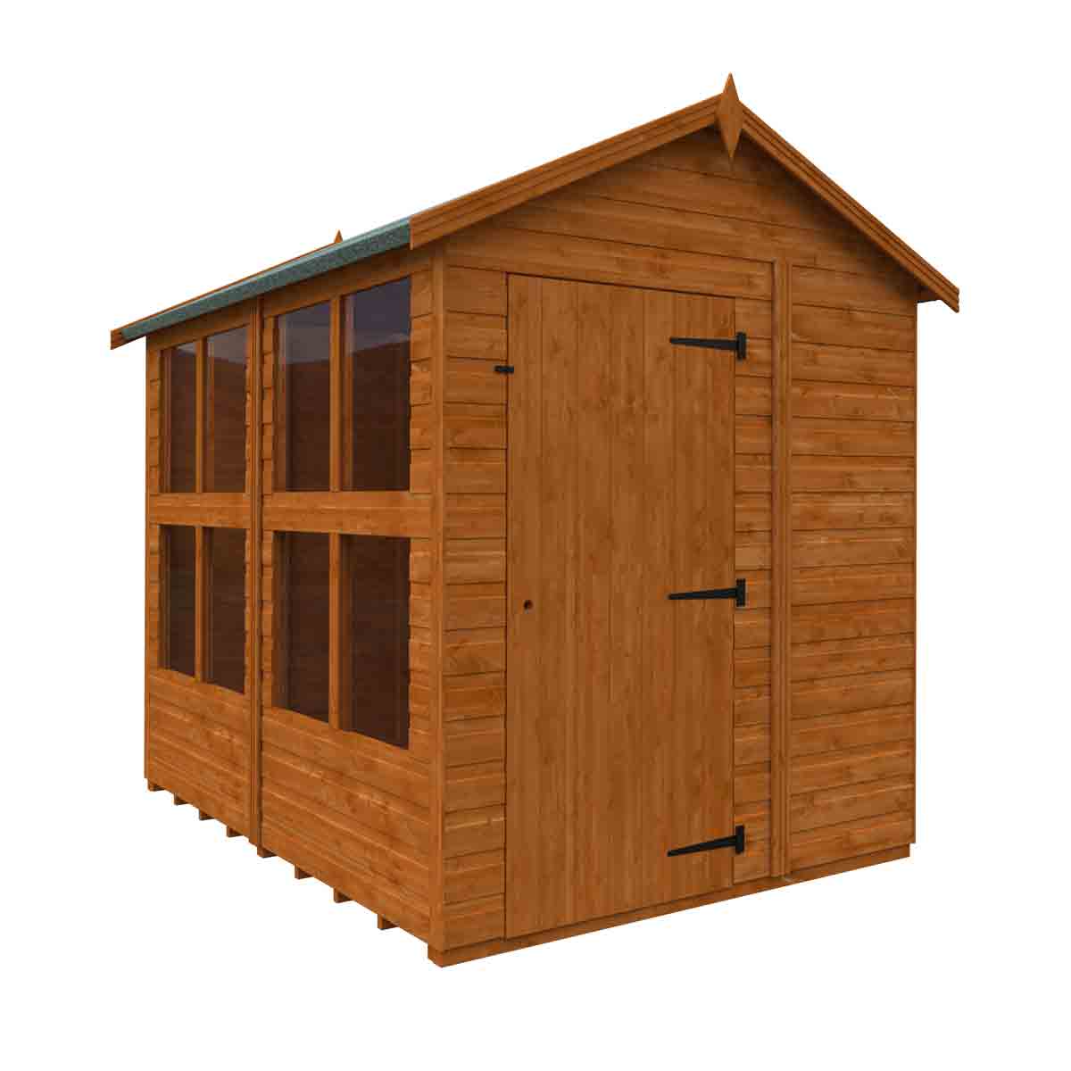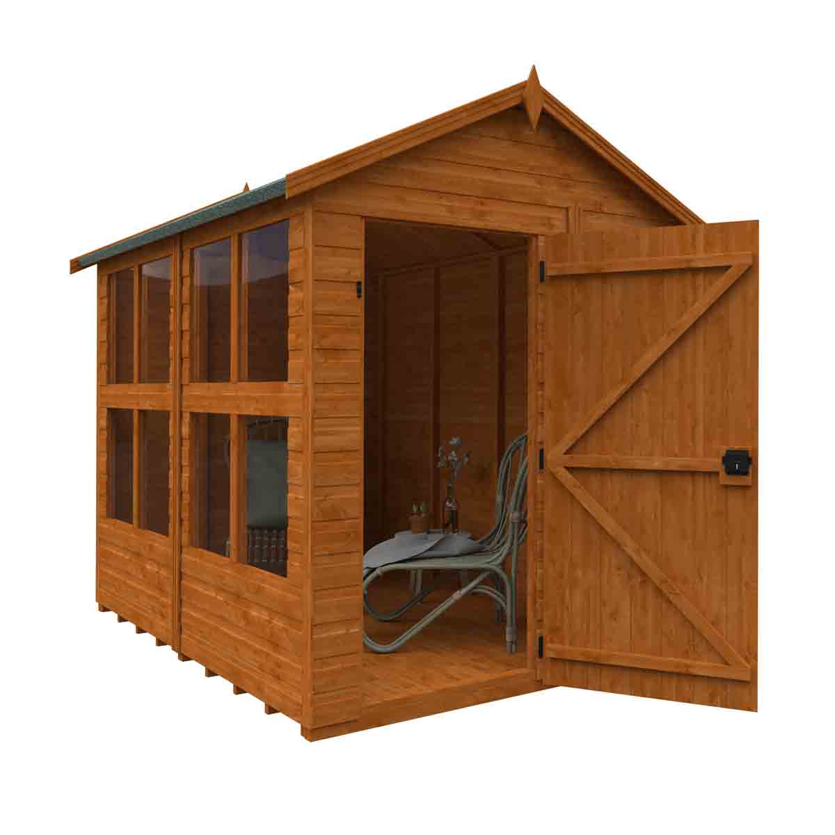 Whether it’s entertaining guests, or somewhere to sit back and relax and enjoy the views of your garden space, the Modular Four Pane Apex Summerhouse is the perfect stylish building for you! Four-pane glazed windows allow maximum sunshine into the building. This modular summerhouse has the flexibility of allowing you to place the windows exactly where you need them so you can create a light and airy space to enjoy. You must ensure that this garden building is assembled strictly in accordance with the assembly instructions that are provided and is installed on a firm and level base constructed from a suitably durable material. The garden building should be treated shortly after assembly, both externally and internally, with a good quality wood preserver and treated with a water-resistant treatment. Treatment should be reapplied annually to prolong the life of your building. All glazing units must be sealed, inside and out with silicone or other watertight solution of your choice (not supplied). Images and photos of products are provided for illustrative purposes only. Please note that product colours can vary slightly due to the digital photography process and variations in individual user monitor settings.