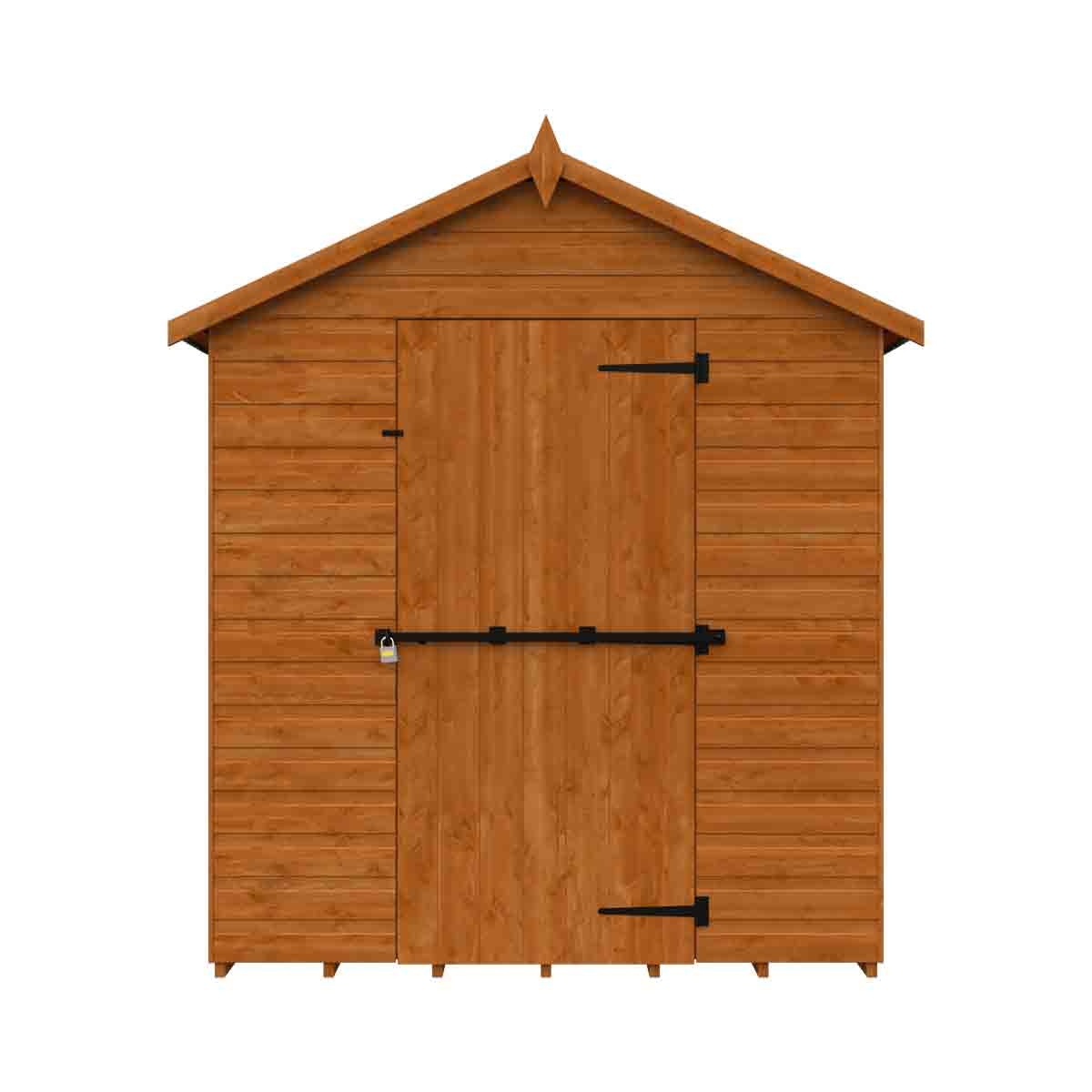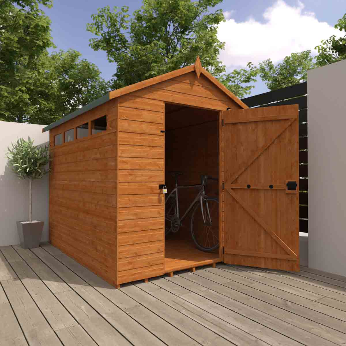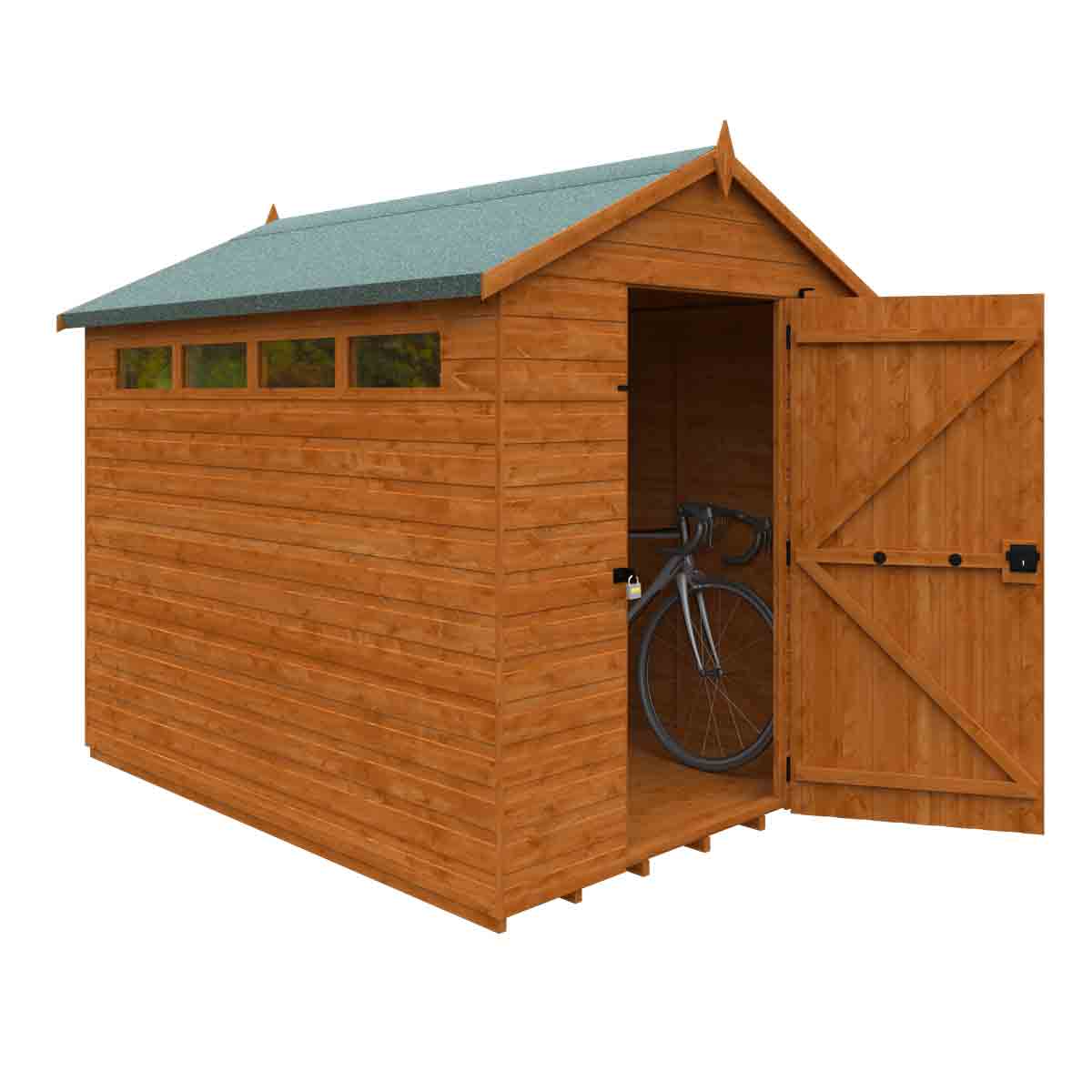 When security matters this fantastic apex shed has all the features to keep your belongings safe. Fitted with a security bar and ‘slit’ windows as standard the security apex is built like a fortress. You must ensure that this garden building is assembled strictly in accordance with the assembly instructions that are provided and is installed on a firm and level base constructed from a suitably durable material. The garden building should be treated shortly after assembly, both externally and internally, with a good quality wood preserver and treated with a water-resistant treatment. Treatment should be reapplied annually to prolong the life of your building. All glazing units must be sealed, inside and out with silicone or other watertight solution of your choice (not supplied). Images and photos of products are provided for illustrative purposes only. Please note that product colours can vary slightly due to the digital photography process and variations in individual user monitor settings.