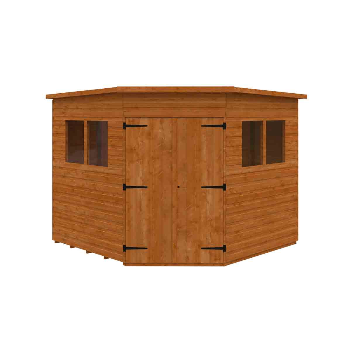 The Corner Shed is a fantastic shed, ideally suited to the corner of any garden. Available in a range of different sizes, it comes with double doors as standard to offer fantastic access. You must ensure that this garden building is assembled strictly in accordance with the assembly instructions that are provided and is installed on a firm and level base constructed from a suitably durable material. The garden building should be treated shortly after assembly, both externally and internally, with a good quality wood preserver and treated with a water-resistant treatment. Treatment should be reapplied annually to prolong the life of your building. All glazing units must be sealed, inside and out with silicone or other watertight solution of your choice (not supplied). Images and photos of products are provided for illustrative purposes only. Please note that product colours can vary slightly due to the digital photography process and variations in individual user monitor settings.