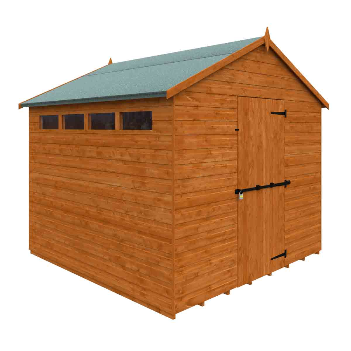 When security matters this fantastic apex shed has all the features to keep your belongings safe. Fitted with a security bar and ‘slit’ windows as standard the security apex is built like a fortress. You must ensure that this garden building is assembled strictly in accordance with the assembly instructions that are provided and is installed on a firm and level base constructed from a suitably durable material. The garden building should be treated shortly after assembly, both externally and internally, with a good quality wood preserver and treated with a water-resistant treatment. Treatment should be reapplied annually to prolong the life of your building. All glazing units must be sealed, inside and out with silicone or other watertight solution of your choice (not supplied). Images and photos of products are provided for illustrative purposes only. Please note that product colours can vary slightly due to the digital photography process and variations in individual user monitor settings.
