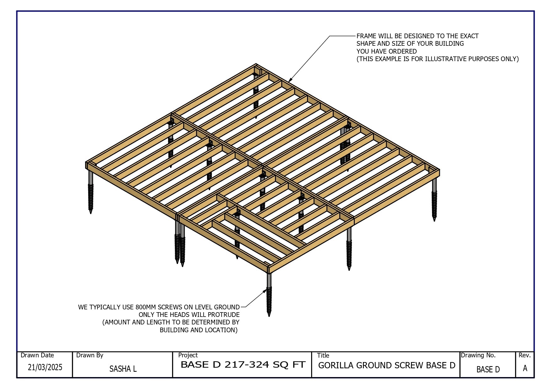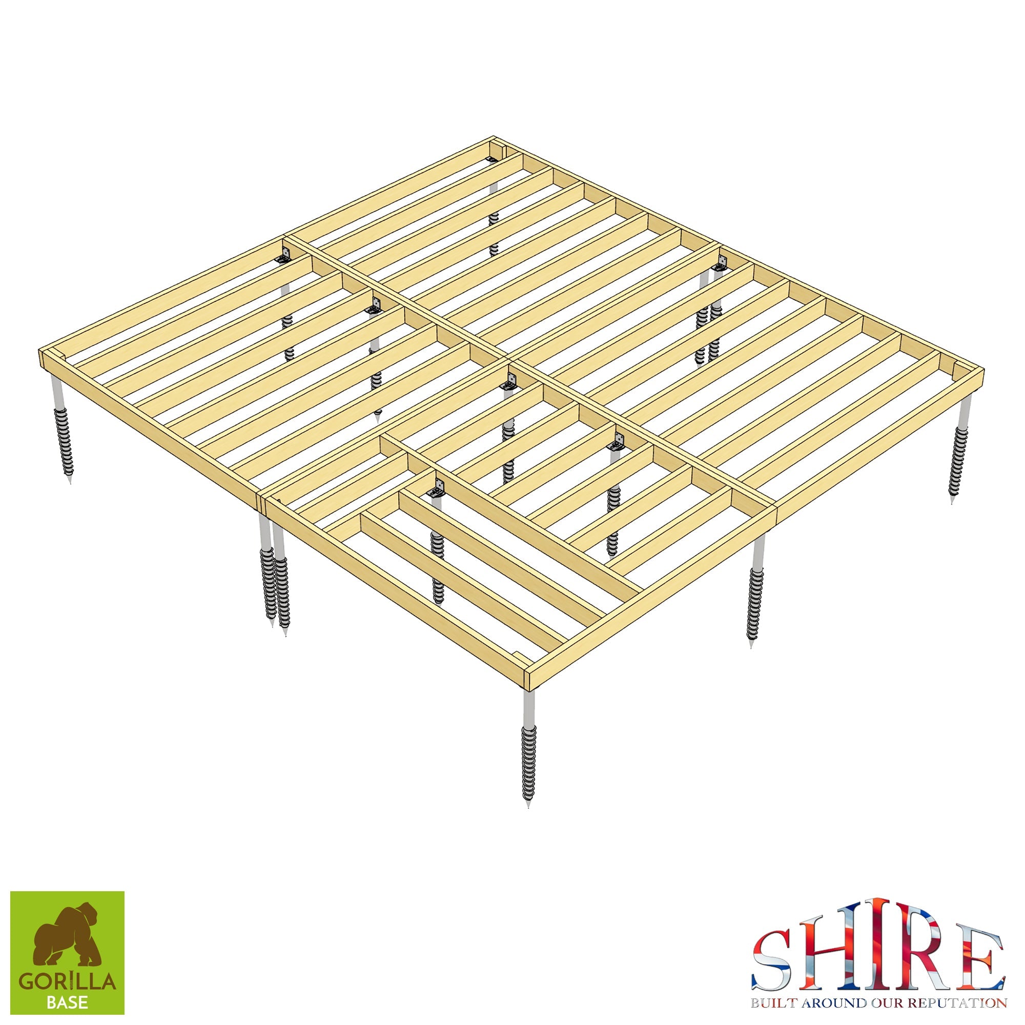 The base must be of solid construction. Should you not have a solid concrete base, we recommend a Gorilla Base. Our Gorilla Base Ground Screw System, uses 1 m long, galvanised screws that come with a lifetime guarantee constructed from 6×2 pressure treated structural grade timber. Not only is this base a more eco-friendly alternative to concrete, but offers the best solution to increase the longevity and functionality of your building, whilst not needing to heavily excavate your garden!
