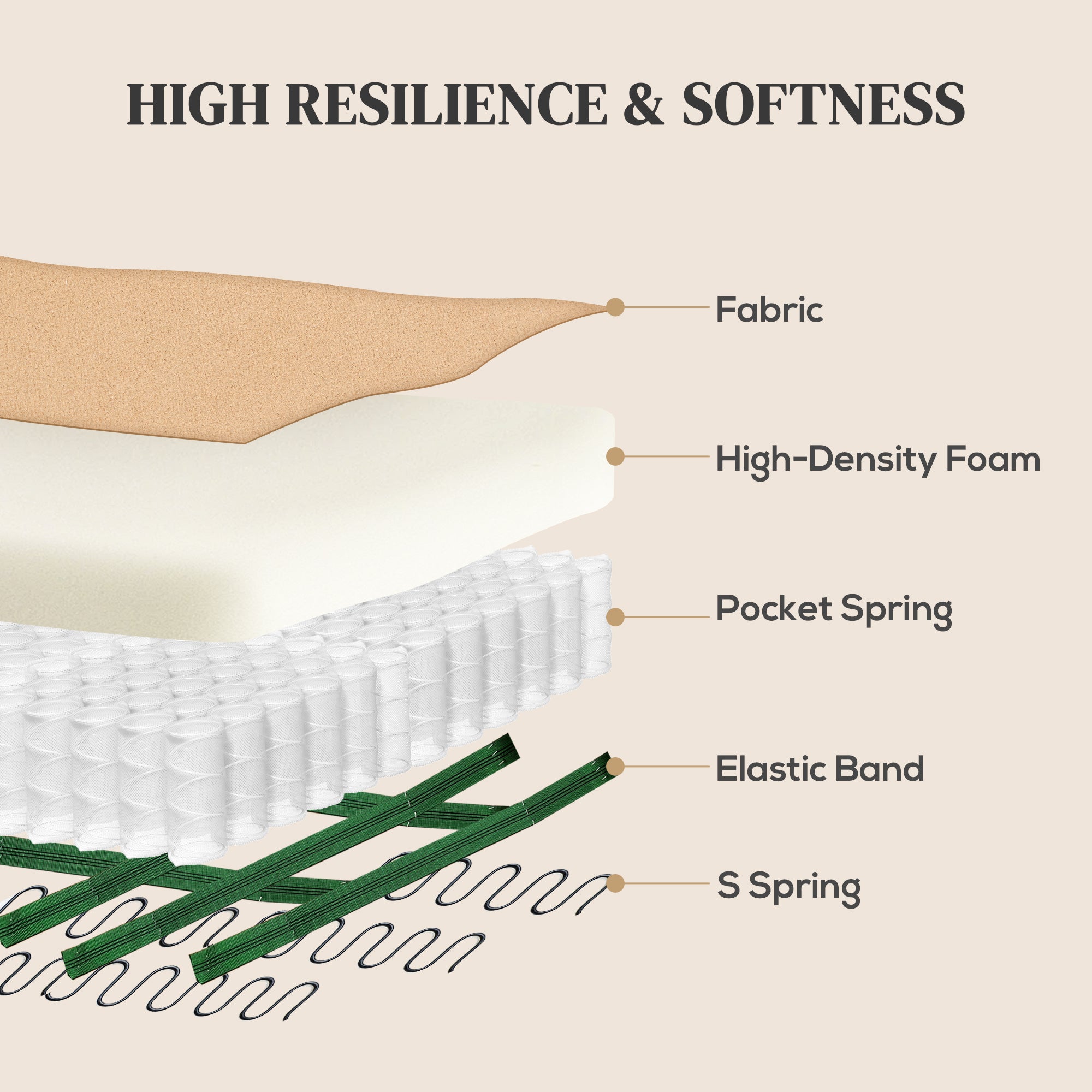- Inner pocket springs, S spring and elastic bands to retain the shape