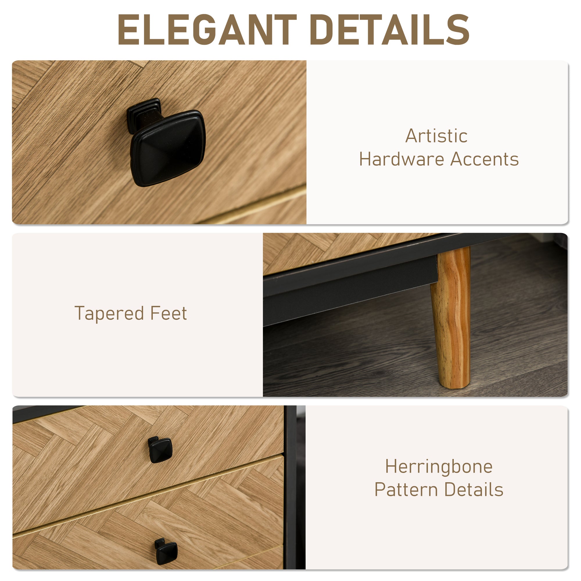 - Bold light-dark contrast, unique herringbone pattern, elegant tapered feet and square hardware accents fit most modern or traditional setting
