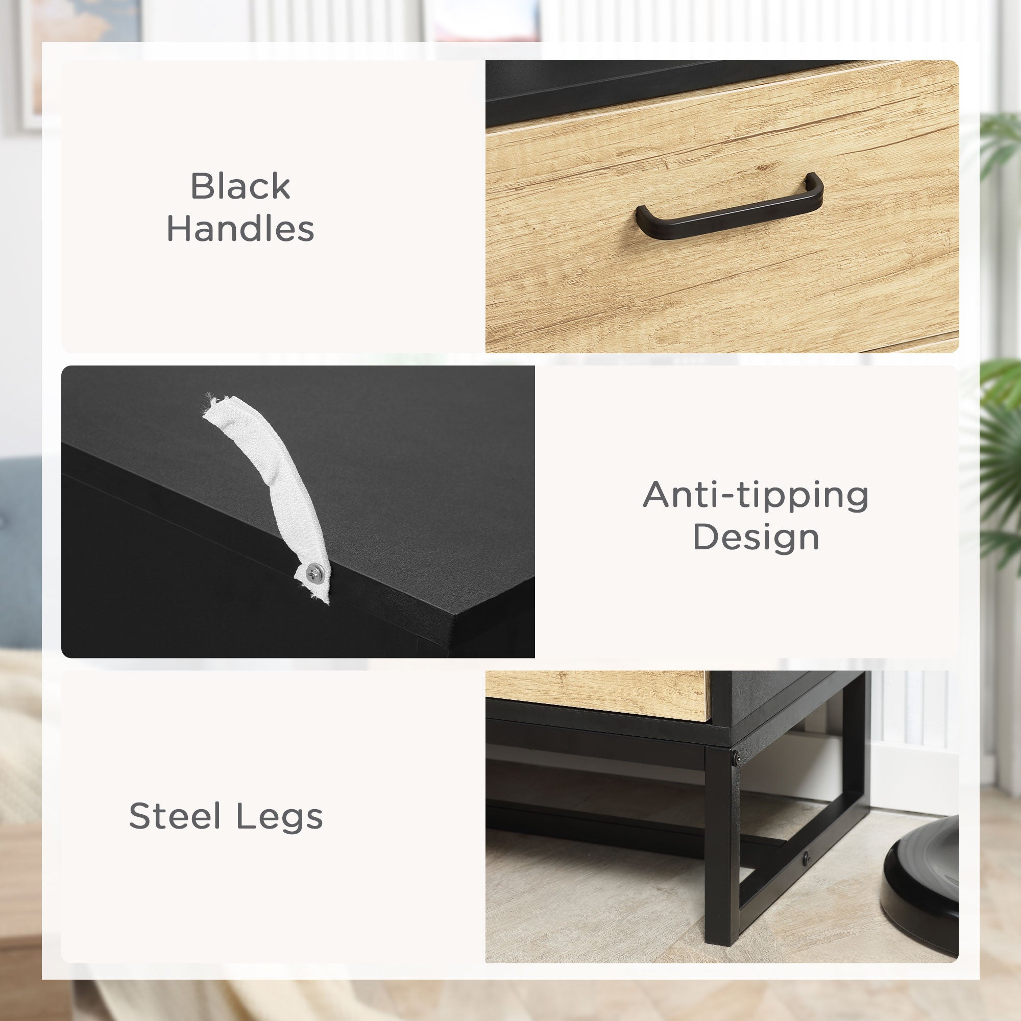 Bedroom drawers and beyond: this HOMCOM piece. Three drawers offer a generous amount of storage for clothing and more. A new take on industrial style: a black frame with light wood effect drawers for a look which is sure to make an impact, wherever. The steel frame ensures a strong core, with durable particle board drawers. Elevated bottom makes it easy to clean underneath. Complete with handles on all drawers.