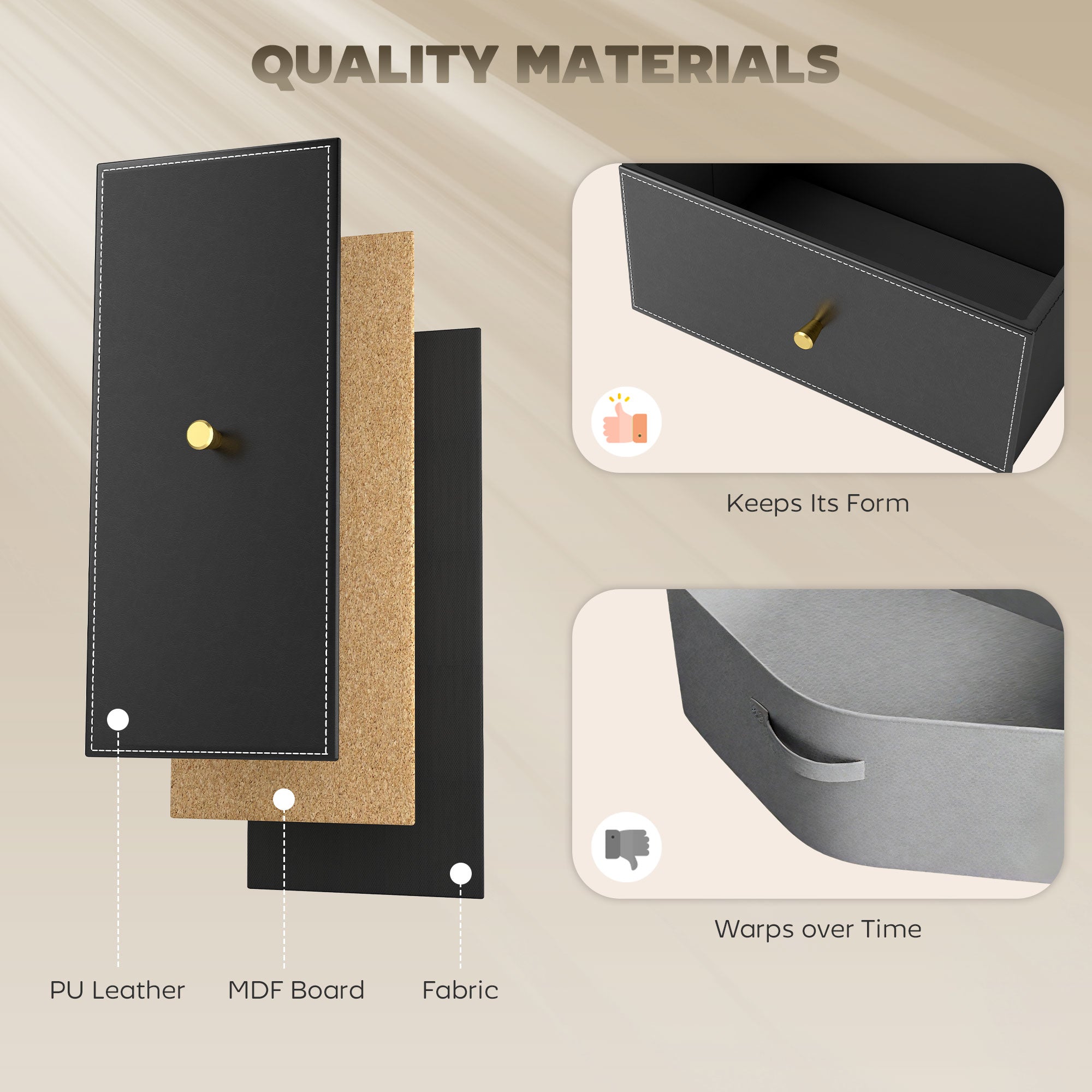 Make it bold - make it sleek with this HOMCOM fabric chest of drawers. Jet black in colour with faux leather drawer fronts, this bedroom drawers unit is a striking piece, with gold coloured accents for a luxe point of difference. It comes with three small drawers and two large drawers - plenty of room for clothes and more. Comes with anti-tipping straps for safety.