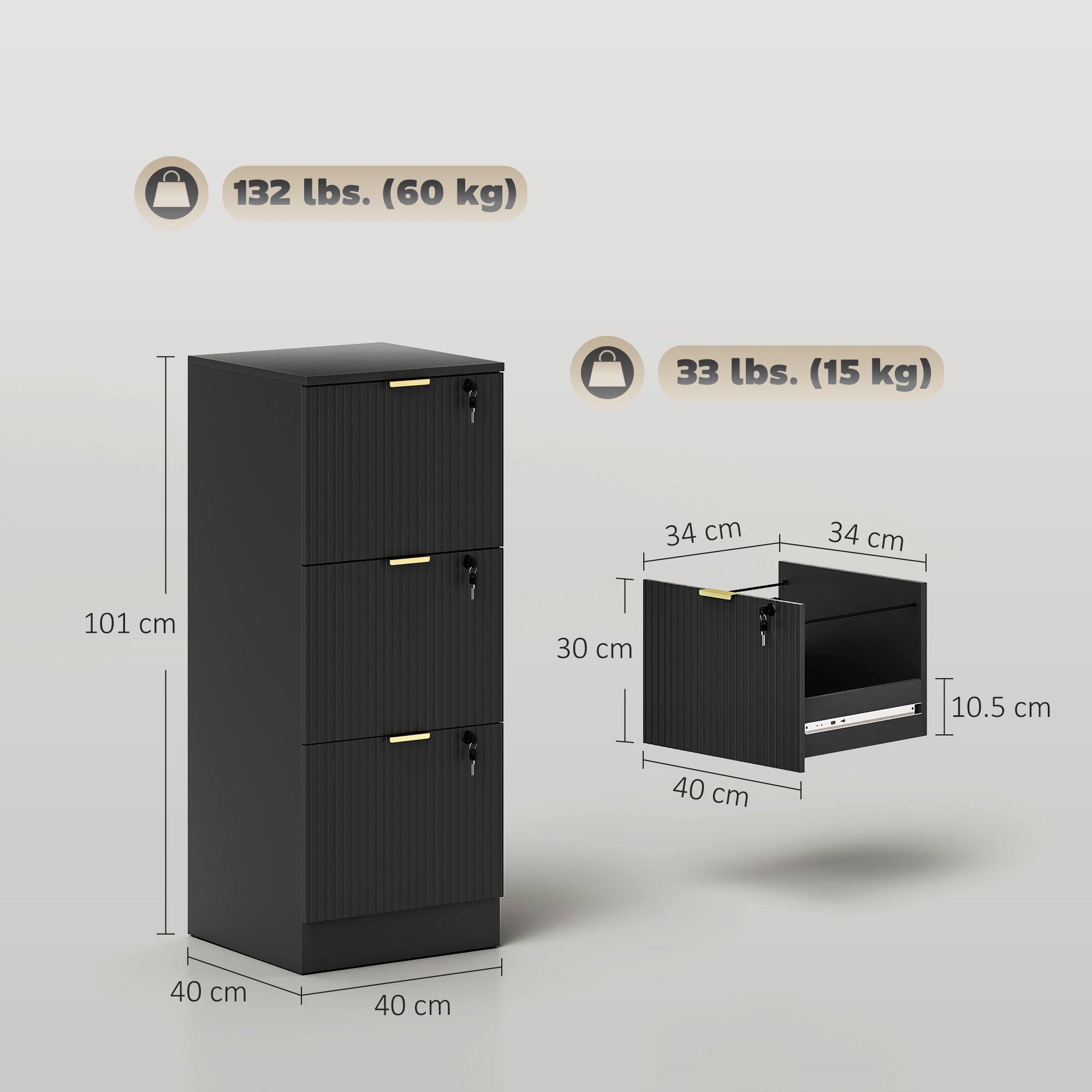 HOMCOM Filing Cabinet, Fluted Vertical File Cabinet with 3 Lockable Drawers and Hanging Rails, Black