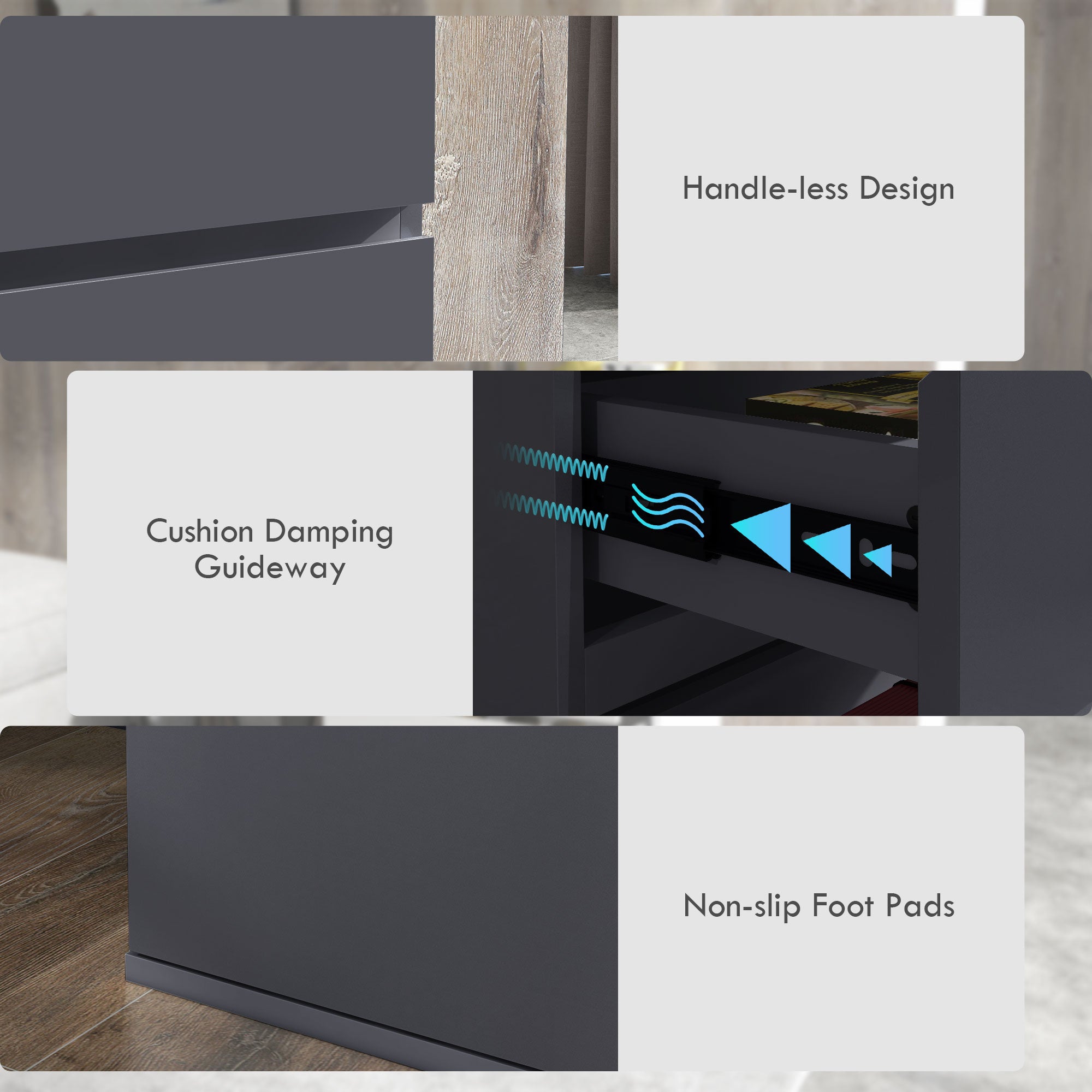 - Cushion damping guideway makes soft closing and prevent fingers from being pinched