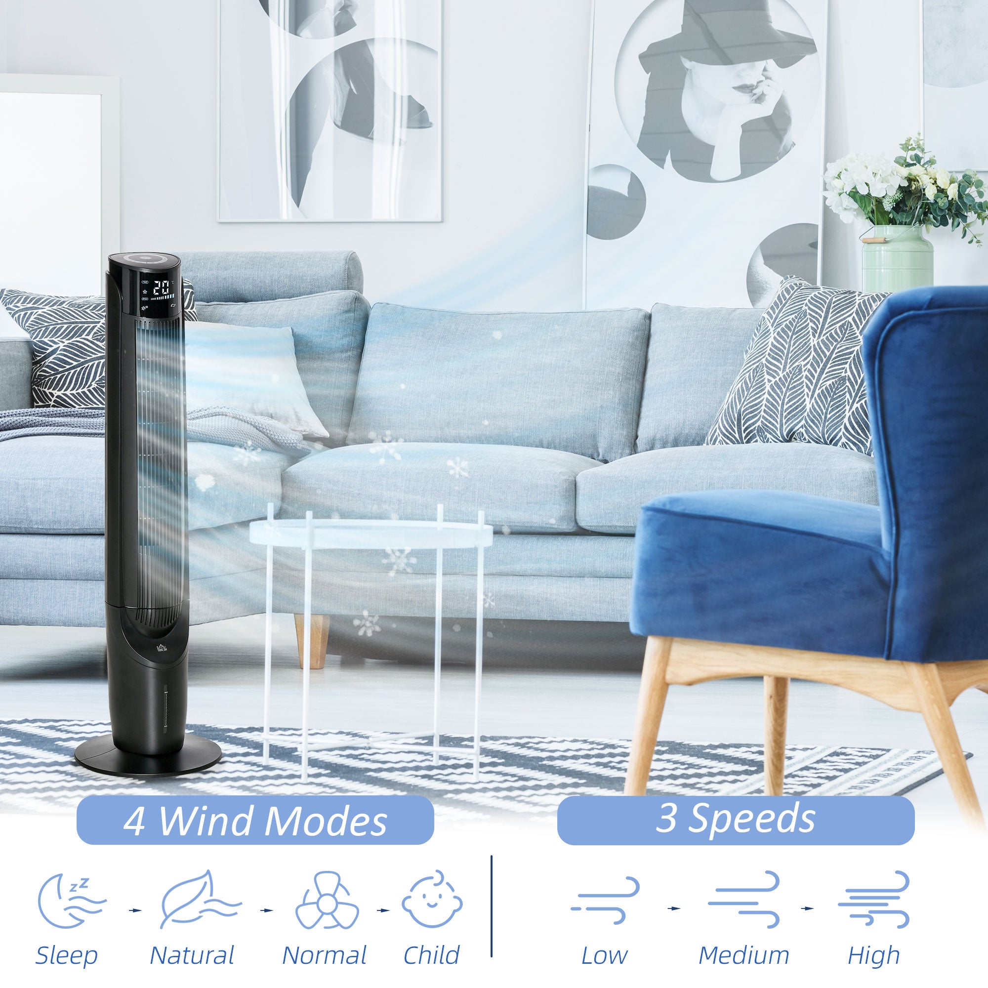 - 4 modes, normal, natural, sleep and child. 3 speeds, low, medium and high