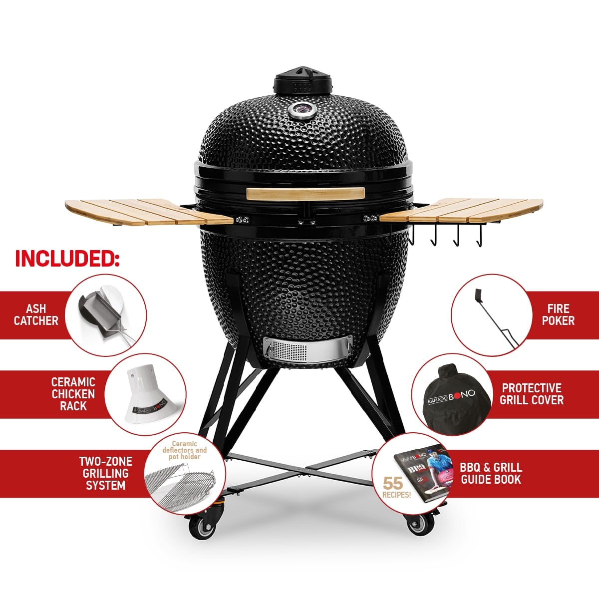 A large and most popular model designed for large groups of people (10 or more). Kamado Bono Grande features a large grilling area, therefore, it is particularly suitable for large dishes (e.g., a large turkey for Christmas). The basic grill set is comprised of a ceramic grill with stand and side trays with hooks, an innovative fibreglass gasket seal, two half-moon stainless steel cooking grates, two half-moon heat deflectors, a Kazan pot holder, a ceramic chicken rack, an ash removal tool, a cookbook and protective grill cover. With the basic grill set, you will be able to grill on direct heat (meat on skewers, steaks, burgers, chicken wings and other dishes grilled under 20 min.), grill on indirect heat (chicken, ham, chops and other larger dishes grilled using a deflector), smoke (ribs, cheese, pulled pork), make soups, pilaf and stews.