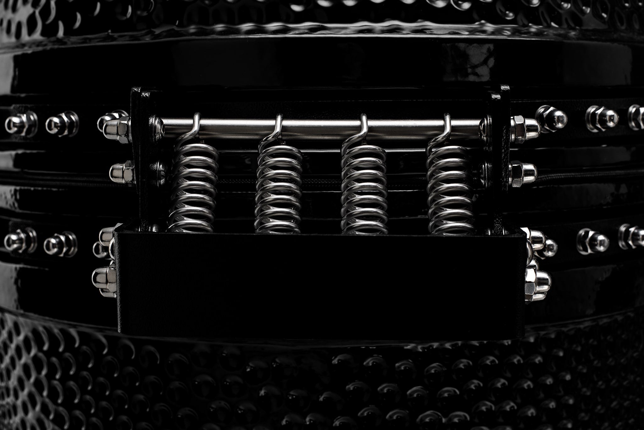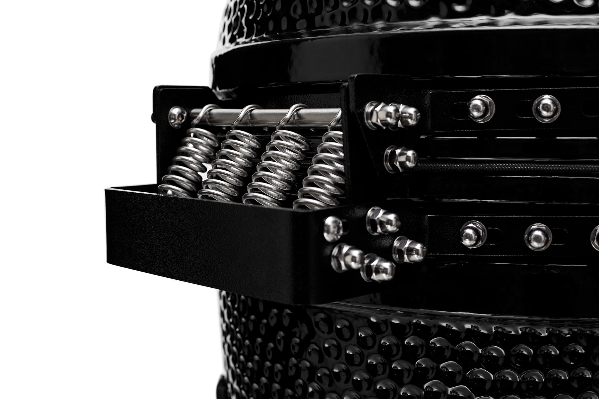 KAMADO Bono Grande barbecue grill has a ceramic frame, inside there is a firebox ¬¬¬– a ceramic tank for charcoal. The bottom part of the structure has an air vent, through which the airflow enters the firebox. The domed lid of the grill has another adjustable air vent, through which the airflow goes out. The vents are used to regulate the cooking temperature. Barbecue grids are placed over the fire to place the steaks on them. As well, the lid has an opening for placing the thermometer to measure the temperature of grilled food.