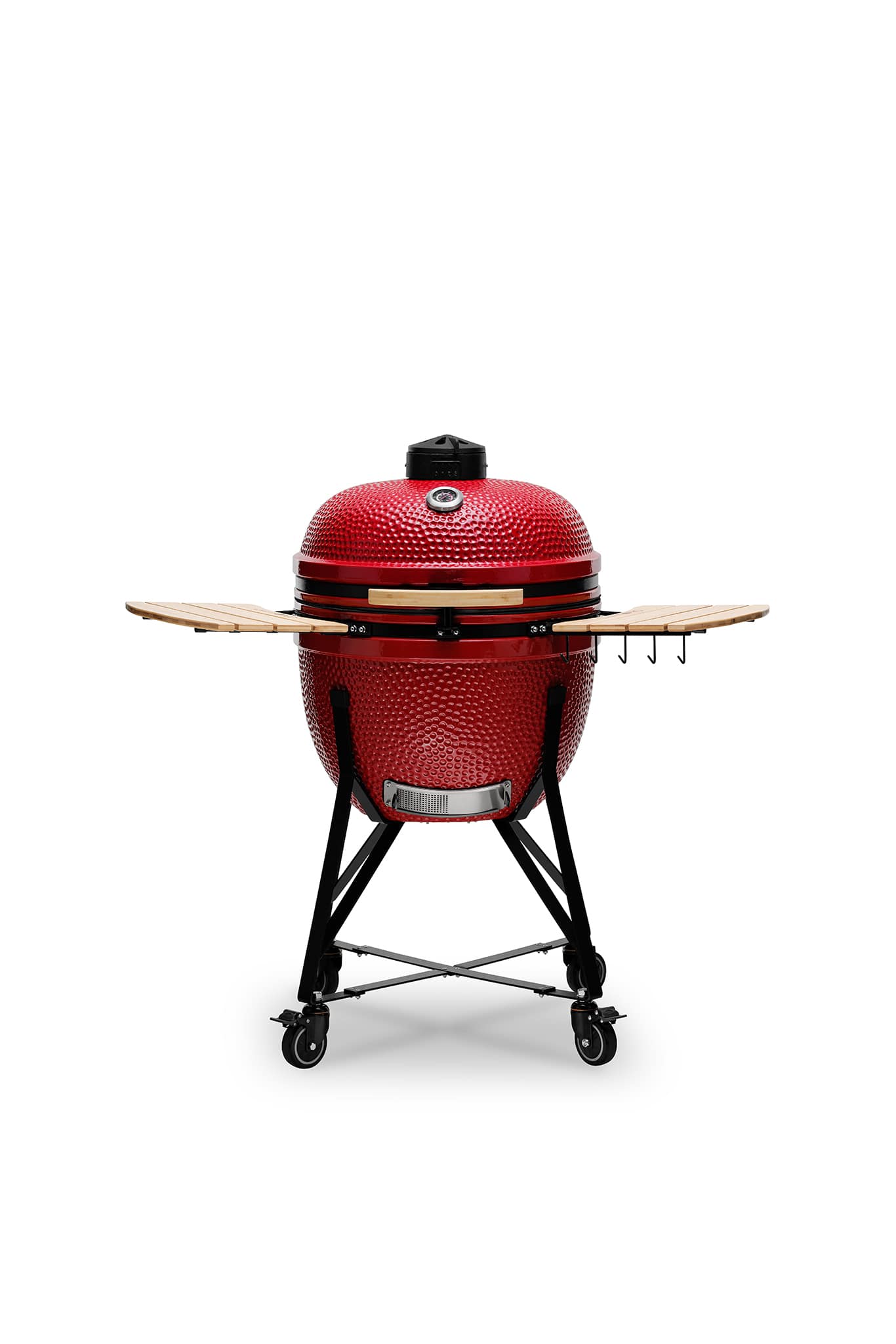 Kamado Bono Limited is perfect to use professionally in restaurants and bars or for large groups of people. The basic grill set is comprised of: ceramic grill with stand and side trays with hooks, an innovative fibreglass gasket seal, two half-moon stainless steel cooking grates, two half-moon heat deflectors, a Kazan pot holder, ceramic chicken rack, ash removal tool, a cookbook and protective grill cover. With the basic grill set you will be able to: grill on direct heat (meat on skewers, steaks, burgers, chicken wings and other dishes grilled under 20 min.), grill on indirect heat (chicken, ham, chops and other larger dishes grilled using a deflector), smoke (ribs, cheese, pulled pork), make soups, pilaf and stews.