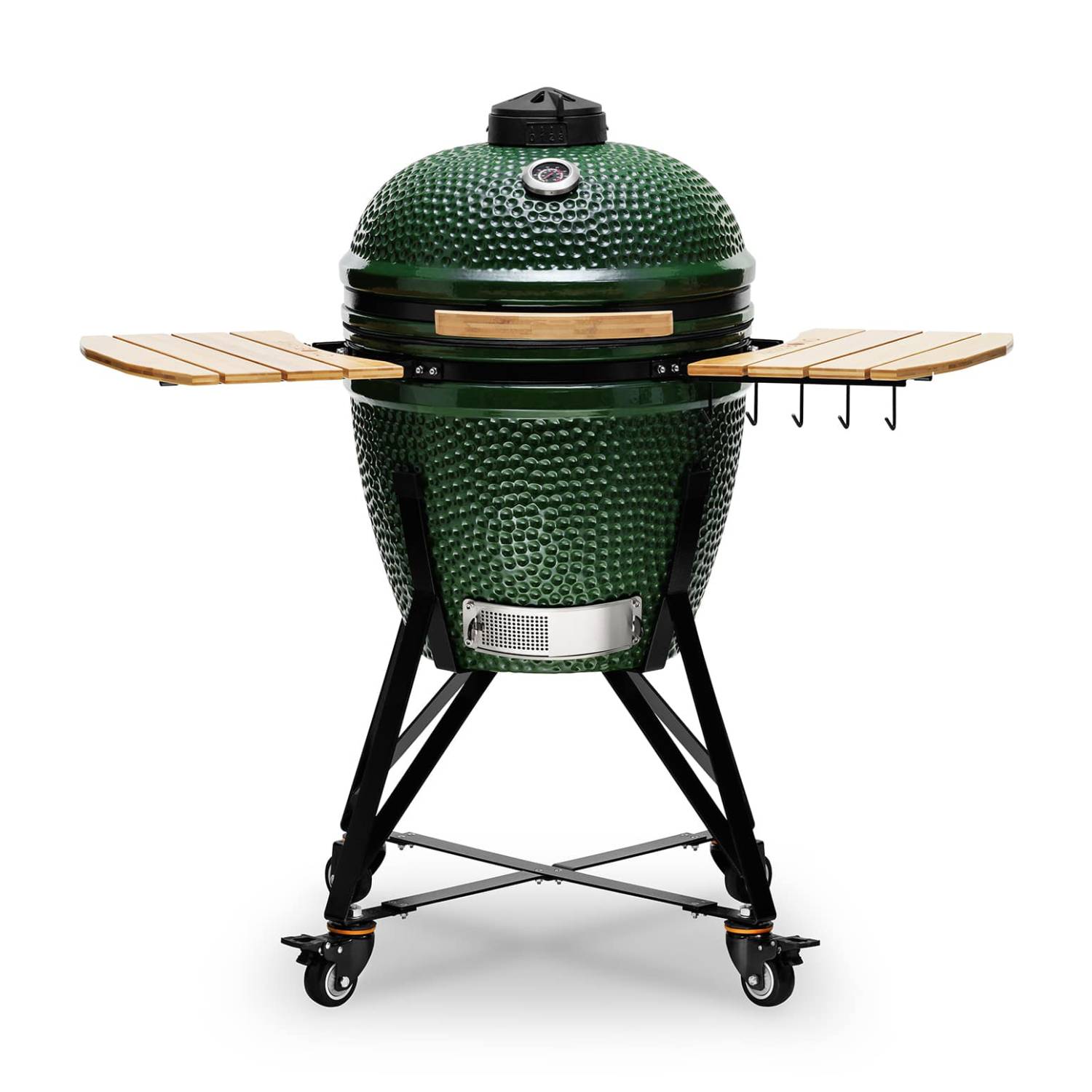 KAMADO Bono Maxi barbecue grill has a ceramic frame, inside there is a firebox ¬¬¬– a ceramic tank for charcoal. The bottom part of the structure has an air vent, through which the airflow enters the firebox. The domed lid of the grill has another adjustable air vent, through which the airflow goes out. The vents are used to regulate the cooking temperature. Barbecue grids are placed over the fire to place the steaks on them. As well, the lid has an opening for placing the thermometer to measure the temperature of grilled food.