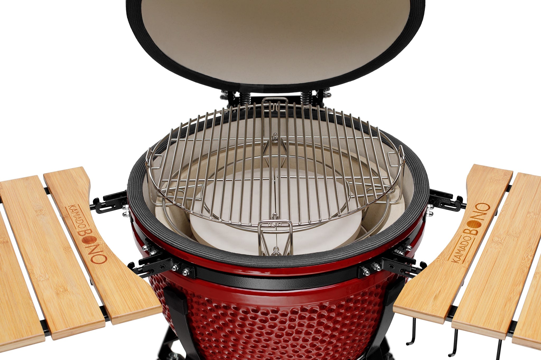 KAMADO Bono Media barbecue grill is fired with charcoal. Wood charcoal does not leave a lot of ash, unlike charcoal briquettes they do not have impurities which can change and distort the taste of the cooked food. Charcoal can be manufactured in an environmentally-friendly manner, i. e. using the coppicing technique. Most importantly, food baked using lump charcoal has natural campfire aroma.