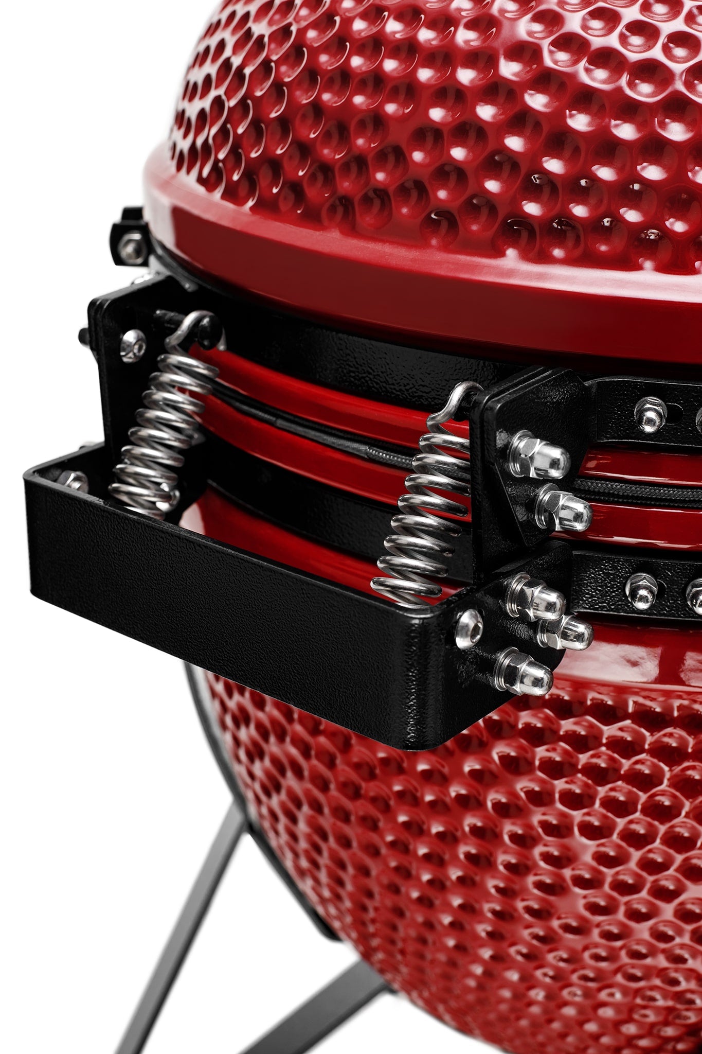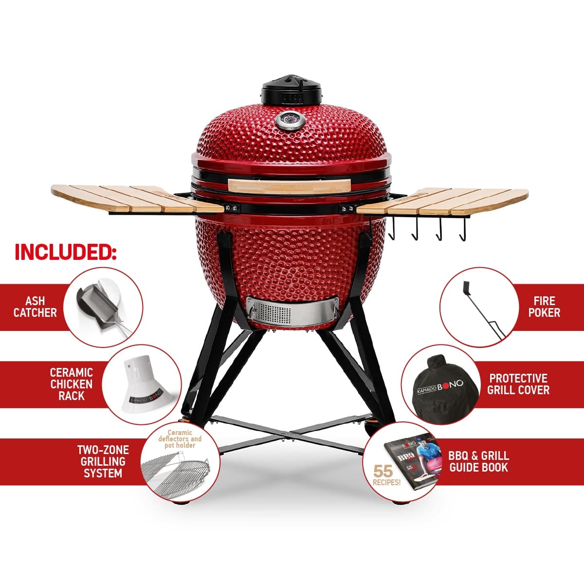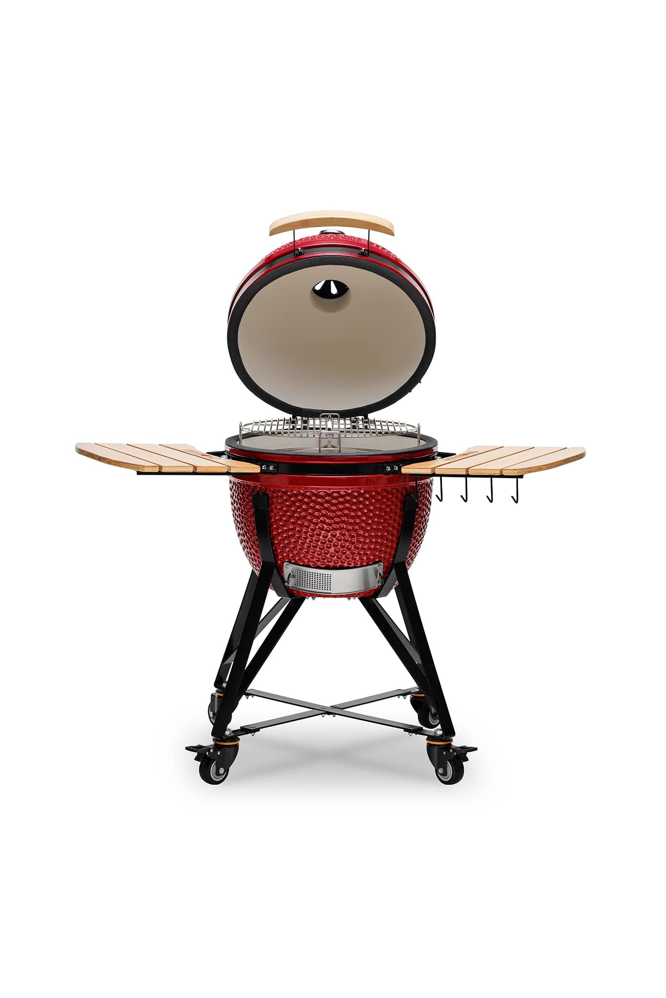 Ideal for larger gatherings, this model caters to families and friend groups (up to 10 people). Perfect for private homes, townhouse terraces, or homestead patios. The set includes a ceramic grill, stand, side trays with hooks, fibreglass gasket seal, two-zone grilling system, side deflectors, Kazan pot holder, ceramic chicken rack, cookbook, ash removal tool, and a protective grill cover. With this set, you can grill directly (kebabs, steaks, burgers), indirectly (chicken, ham, chops), smoke (ribs, cheese, pulled pork), and prepare soups, pilaf, and stews.
