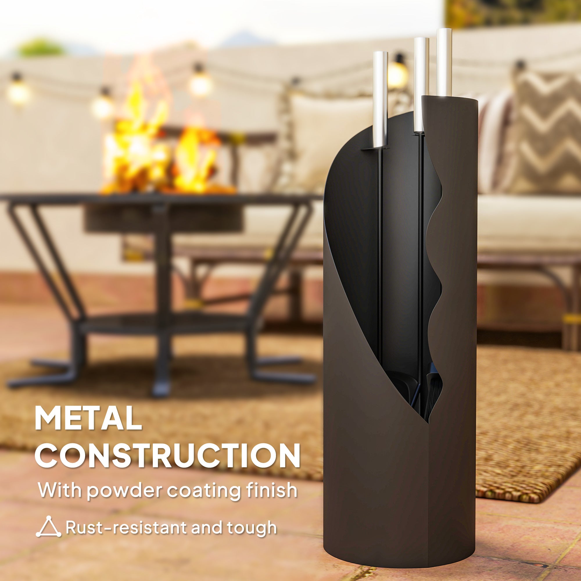 Warm up your hearth with the Outsunny fireplace companion set, a charming addition to any indoor or outdoor setting. This four-piece set includes a broom, a shovel, a poker and a bucket, all crafted in metal with a sleek black powder coating. Enjoy effortless maintenance and a timeless look with these essential fireplace accessories.