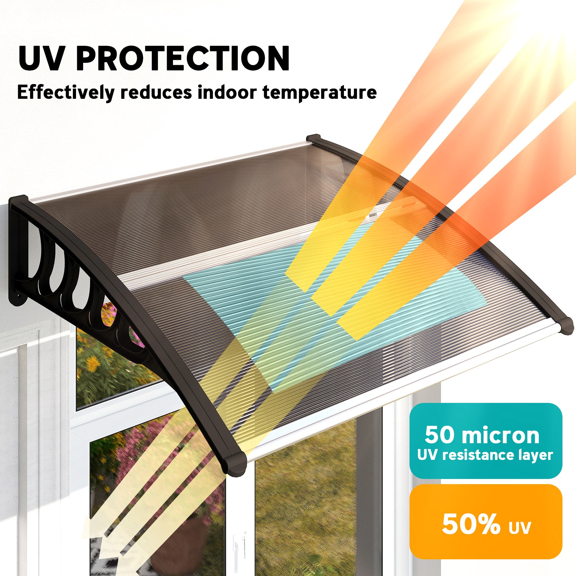 Keep the elements away from your doors and windows, all year long with this Outsunny door canopy. Curved shape covers a larger area, whilst preventing any build-up on the end half. The aluminium frame is strong so it holds on place; it can be easily mounted on the wall with all required accessories included in the package. Each panel features a UV-resistant coating for protection against damaging rays - whether it's sunny, gentle snow, moderate breeze or light-medium rainy.