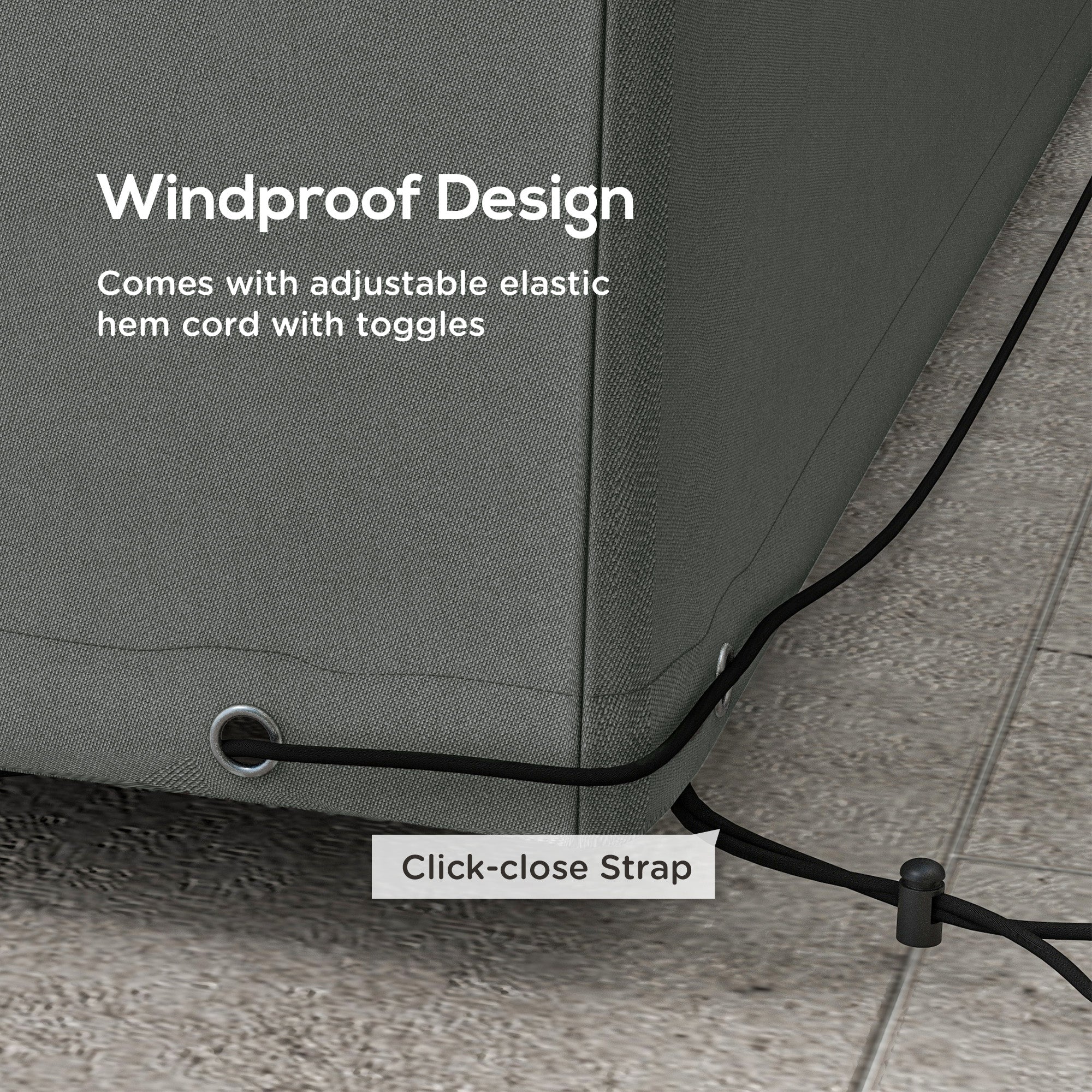- Drawstring pull cord with weatherproof eyelets and cord lock to hold cover in place